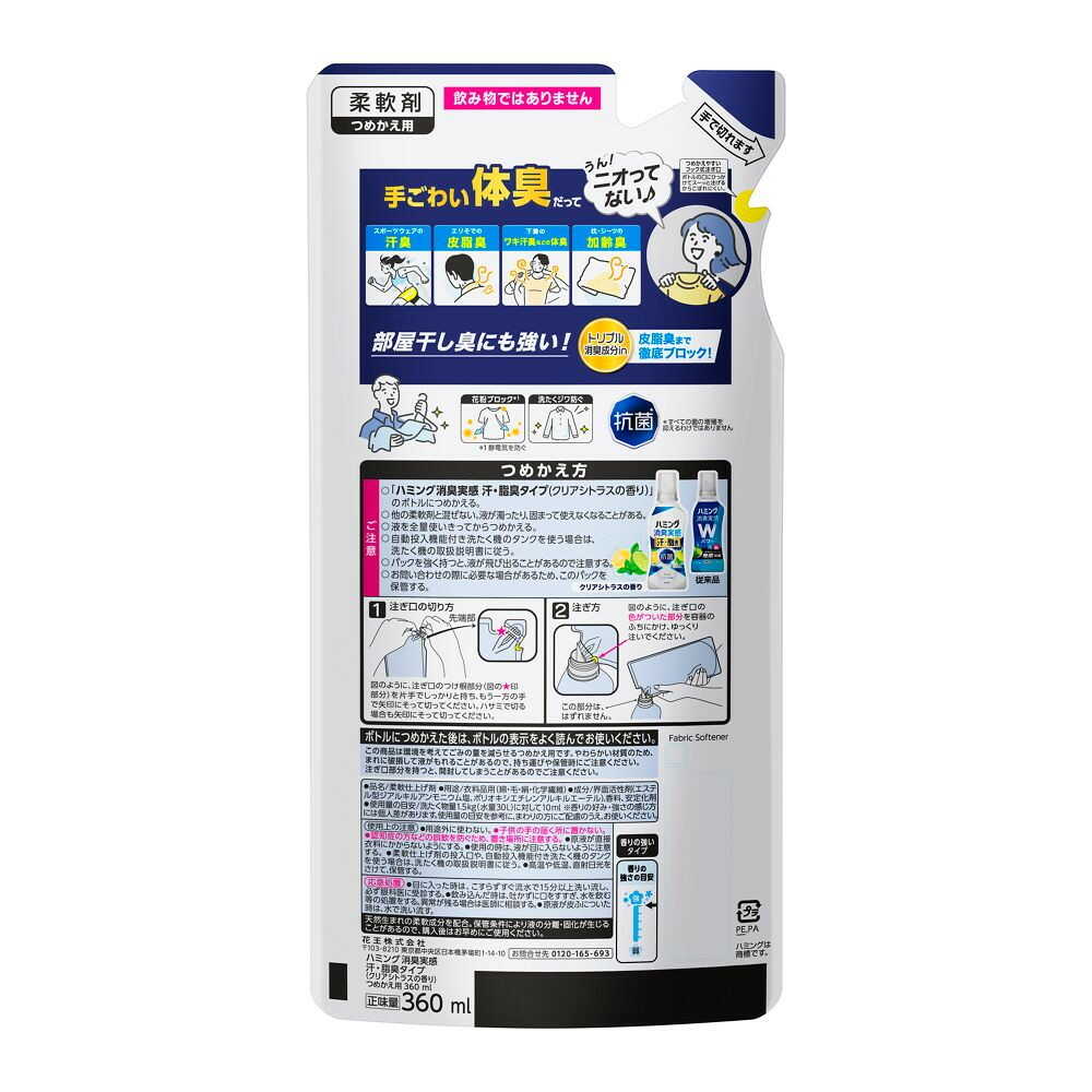 つめかえ方 ご注意 ○「ハミング消臭実感 汗・脂臭タイプ(クリアシトラスの香り)」のボトルにつめかえる。 ○他の柔軟剤と混ぜない。液が濁ったり、固まって使えなくなることがある。 ○液を全量使いきってからつめかえる。 ○自動投入機能付き洗たく機のタンクを使う場合は、洗たく機の取扱説明書に従う。 ○パックを強く持つと、液が飛び出ることがあるので注意する。 ○お問い合わせの際に必要な場合があるため、このパックを保管する。 使用上の注意 ●用途外に使わない。 ●子供の手の届く所に置かない。 ●認知症の方などの誤飲を防ぐため、置き場所に注意する。 ●原液が直接衣料にかからないようにする。 ●使用の時は、液が目に入らないように注意する。 ●柔軟仕上げ剤の投入口や、自動投入機能付き洗たく機のタンクを使う場合は、洗たく機の取扱説明書に従う。 ●高温や低温、直射日光をさけて、保管する。
