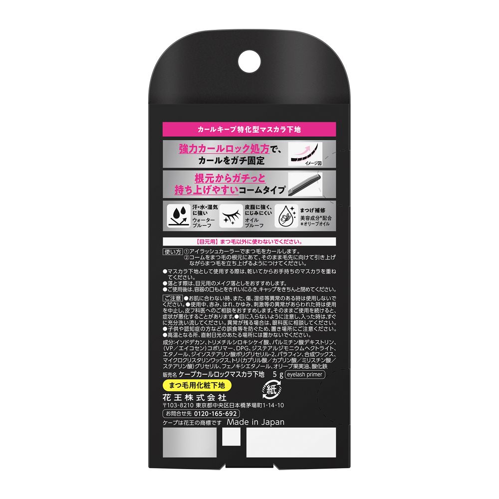 カールキープ特化型マスカラ下地 強力カールロック処方で、カールをガチ固定 根元からガチっと持ち上げやすいコームタイプ 汗・水・湿気に強いウォータープルーフ 皮脂に強くにじみにくいオイルプルーフ まつげ補修、美容成分(オリーブオイル)配合