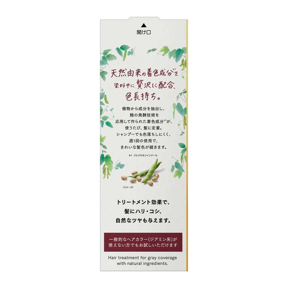天然由来の着色成分*1を染料中に贅沢に配合、色長持ち。 植物から成分を抽出し、麹の発酵技術を応用して作られた着色成分*1が、使うたび、髪に定着。 シャンプーでも色落ちしにくく、週1回の使用で、きれいな髪色が続きます。 *1 ジヒドロキシインドール トリートメント効果で、髪にハリ・コシ、自然なツヤも与えます。 一般的なヘアカラー(ジアミン系)が使えない方でもお試しいただけます Hair treatment for gray coverage with natural ingredients.