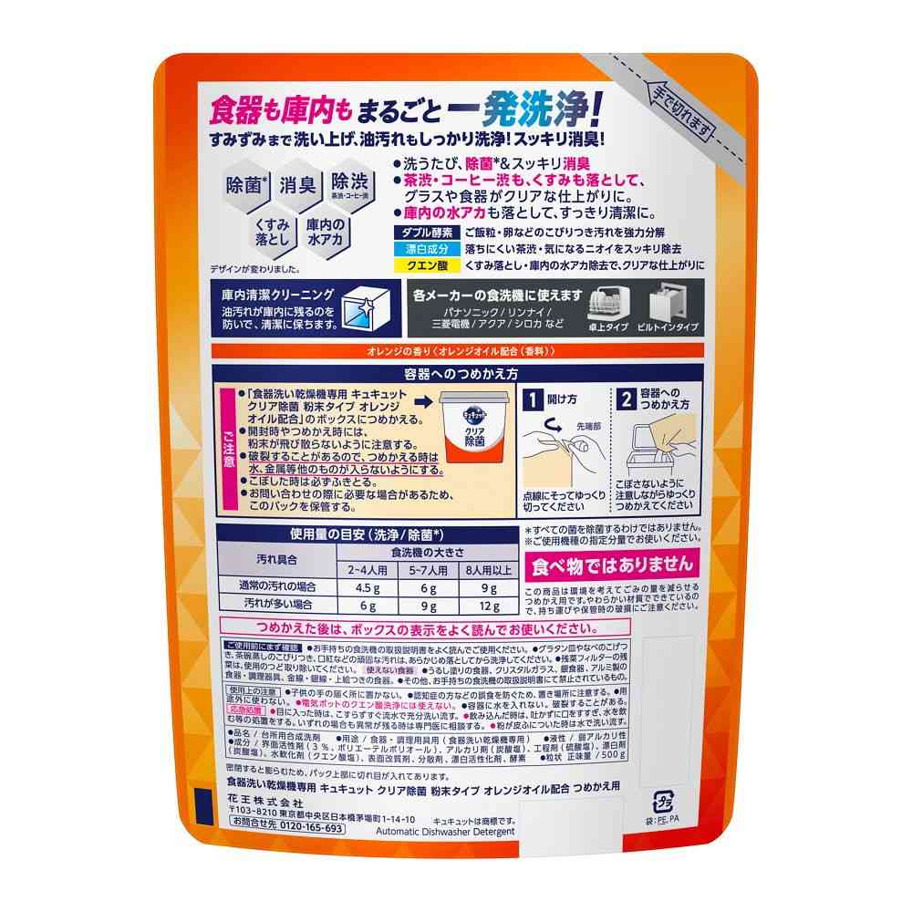 容器へのつめかえ方のご注意 ●「食器洗い乾燥機専用 キュキュット クリア除菌 粉末タイプ オレンジ オイル配合」のボックスにつめかえる。 ●開封時やつめかえ時には、粉末が飛び散らないように注意する。 ●破裂することがあるので、つめかえる時は水、金属等他のものが入らないようにする。 ●こぼした時は必ずふきとる。 ●お問い合わせの際に必要な場合があるため、このパックを保管する。 使用上の注意 ●子供の手の届く所に置かない。 ●認知症の方などの誤食を防ぐため、置き場所に注意する。 ●用途外に使わない。 ●電気ポットのクエン酸洗浄には使えない。 ●容器に水を入れない。破裂することがある。