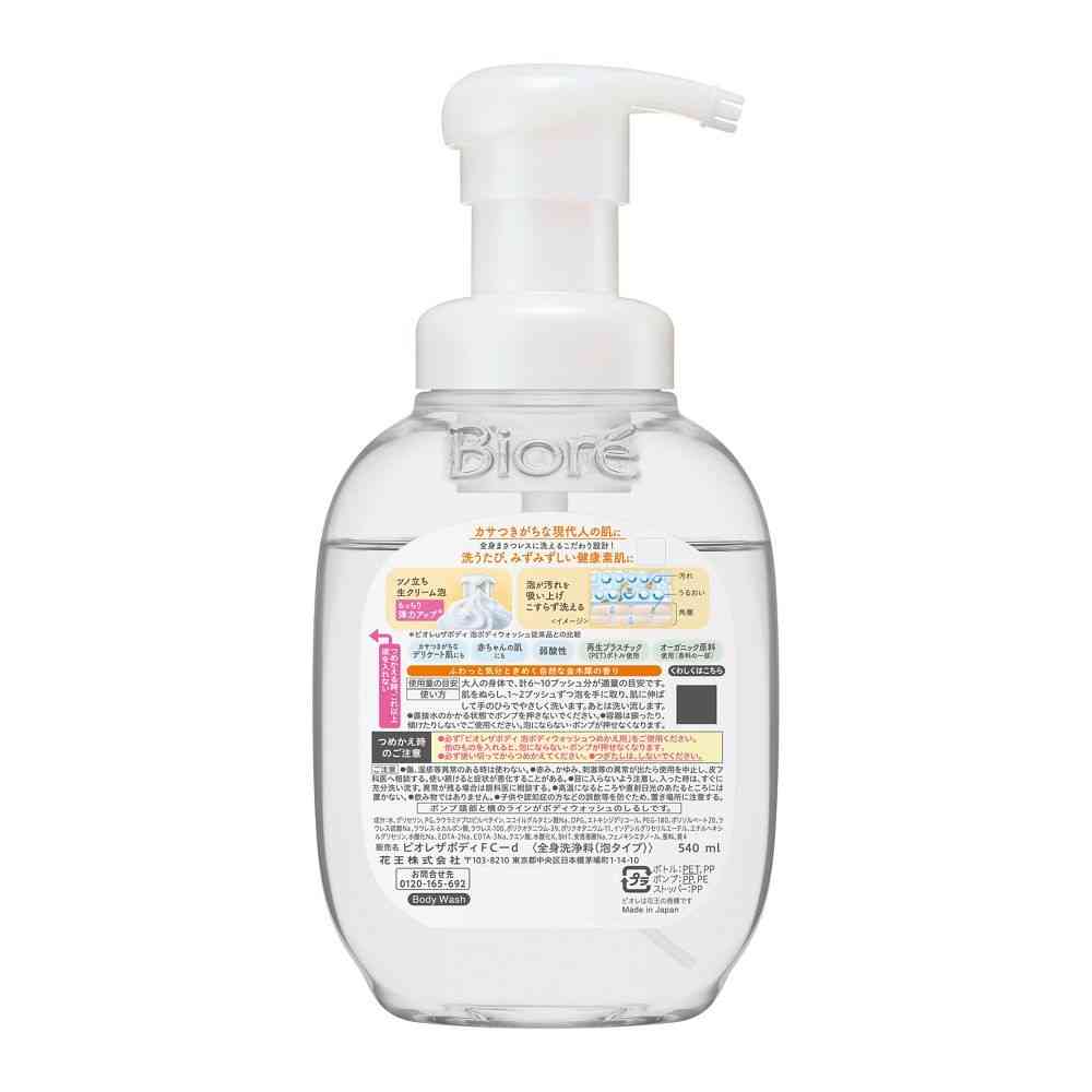 カサつきがちな現代人の肌に 全身まさつレスに洗えるこだわり設計! 洗うたび、みずみずしい健康素肌に ツノ立ち生クリーム泡 もっちり弾力アップ※ ※ビオレuザボディ 泡ボディウォッシュ従来品との比較 泡が汚れを吸い上げこすらず洗える カサつきがちなデリケート肌にも 赤ちゃんの肌にも 弱酸性 再生プラスチック(PET)ボトル使用 オーガニック原料使用(香料の一部)