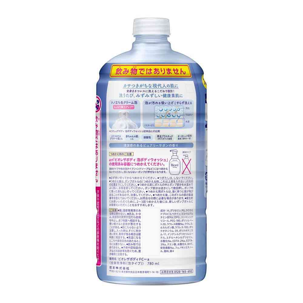 つめかえ時のご注意 必ず「ビオレザボディ 泡ボディウォッシュ」の使用済み容器につめかえてください。 液体タイプや他の泡タイプ(ハンドソープなど)にはつめかえないでください。泡にならない・ポンプが押せなくなります。 ●必ず使い切ってからつめかえてください。 ●つぎたしは、しないでください。 ●つめかえ量は、ポンプボトルの「つめかえる時、これ以上液を入れない」の矢印の位置までにしてください。 ●つめかえ前にボトルの中とポンプ部分を水道水でよく洗い、水気を切ってください。ポンプ部分は逆さにして数回押し、ポンプ内に残った液も出し切ってください。 ●つめかえ用ボトルは、強く持つと液が飛び出ることがあるので、注意してください。 ●つめかえ後、このボトルの底の製造番号を控えておいてください。お問合せの際に必要な場合があります。 ●衛生的にお使いいただくために、2~3回つめかえた後には、新しいポンプボトルにお取替えいただくことをおすすめします。 ご注意 ●傷、湿疹等異常のある時は使わない。 ●赤み、かゆみ、刺激等の異常が出たら使用を中止し、皮フ科医へ相談する。使い続けると症状が悪化することがある。 ●目に入らないよう注意し、入った時は、すぐに充分洗い流す。異常が残る場合は眼科医に相談する。 ●高温になるところや直射日光のあたるところには置かない。 ●飲み物ではありません。 ●子供や認知症の方などの誤飲等を防ぐため、置き場所に注意する。