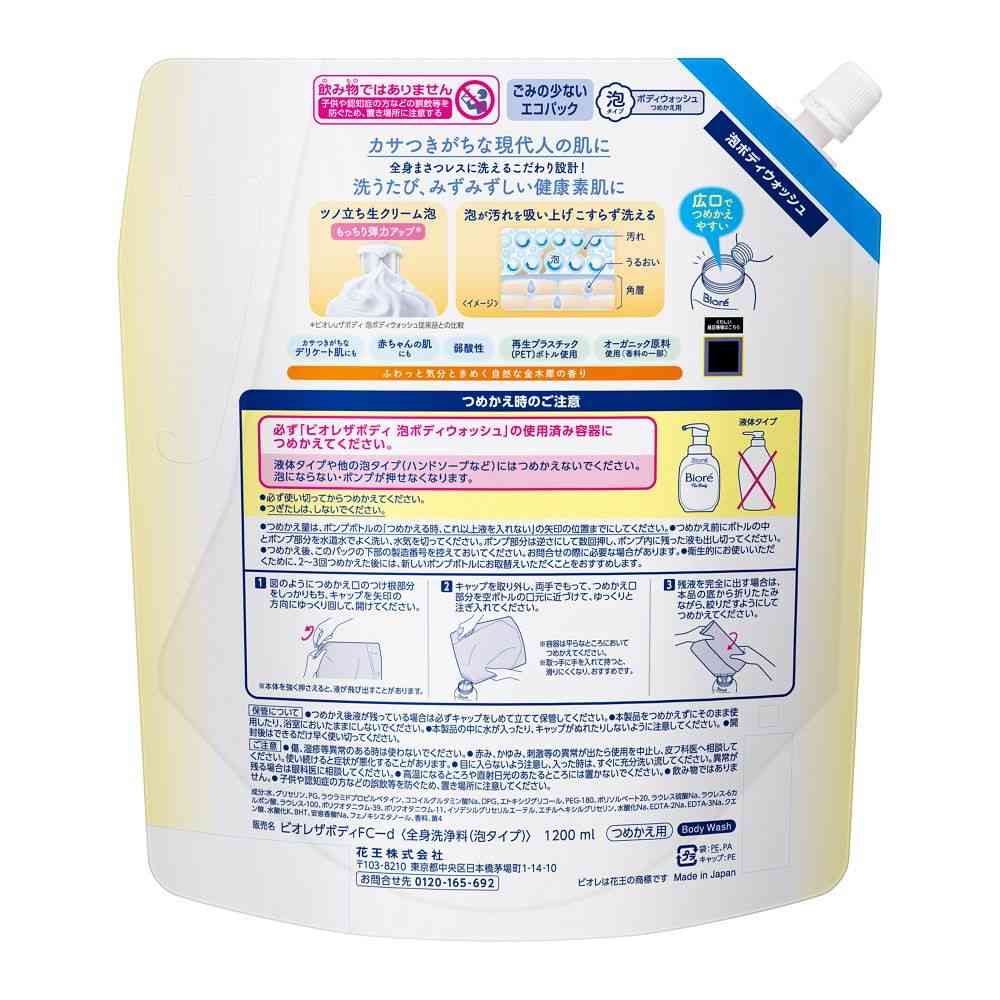 つめかえ時のご注意 必ず「ビオレザボディ 泡ボディウォッシュ」の使用済み容器につめかえてください。 液体タイプや他の泡タイプ(ハンドソープなど)にはつめかえないでください。泡にならない・ポンプが押せなくなります。 ●必ず使い切ってからつめかえてください。 ●つぎたしは、しないでください。 ●つめかえ量は、ポンプボトルの「つめかえる時、これ以上液を入れない」の矢印の位置までにしてください。 ●つめかえ前にボトルの中とポンプ部分を水道水でよく洗い、水気を切ってください。ポンプ部分は逆さにして数回押し、ポンプ内に残った液も出し切ってください。 ●つめかえ後、このパックの下部の製造番号を控えておいてください。お問合せの際に必要な場合があります。 ●衛生的にお使いいただくために、2~3回つめかえた後には、新しいポンプボトルにお取替えいただくことをおすすめします。 ご注意 ●傷、湿疹等異常のある時は使わないでください。 ●赤み、かゆみ、刺激等の異常が出たら使用を中止し、皮フ科医へ相談してください。使い続けると症状が悪化することがあります。 ●目に入らないよう注意し、入った時は、すぐに充分洗い流してください。異常が残る場合は眼科医に相談してください。 ●高温になるところや直射日光のあたるところには置かないでください。 ●飲み物ではありません。 ●子供や認知症の方などの誤飲等を防ぐため、置き場所に注意してください。