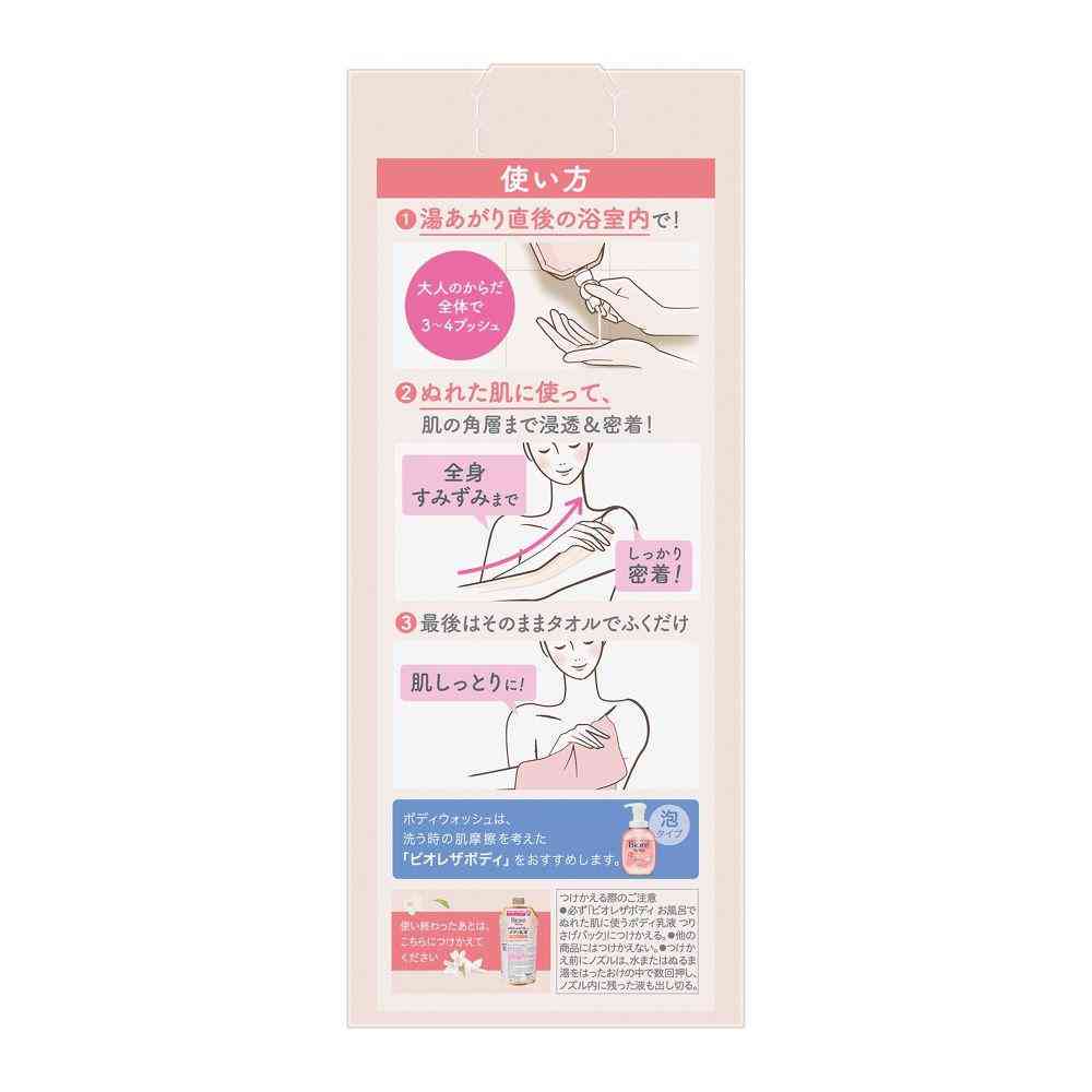 花王株式会社、kao、ビオレ、ビオレザボディ、お風呂でぬれた肌に使うボディ乳液、お風呂、風呂、濡れた、濡れたまま使う、インバス、ボディ、ボディケア、ボディローション、保湿、乾燥、粉吹き、カサカサ、全身乳液、乳液、ローション、吊り下げ、つり下げ、しっとり、ミルクティー、ホワイトティー、本体