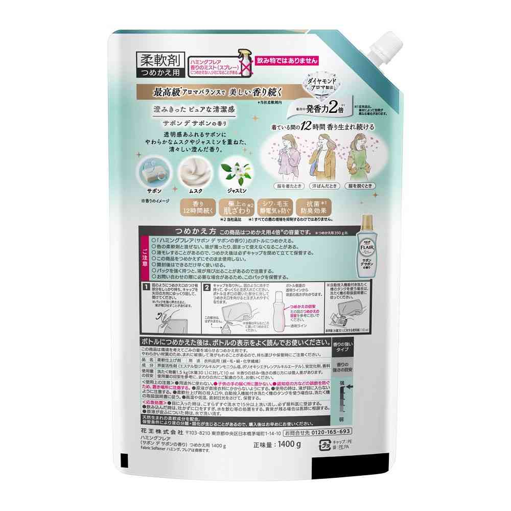 最高級※アロマバランスで美しい香り続く ※メーカー柔軟剤内 ダイヤモンドアロマ製法 着用中発香力2倍※1 ※1従来品比。素材によって効果が異なる場合があります。 着ている間の12時間 香り生まれ続ける 香り12時間続く 極上の肌ざわり※2 シワ・毛玉静電気を防ぐ 抗菌※1防臭効果 ※2 メーカー品比 ※1 すべての菌の増殖を抑制するわけではありません。 詰め替え用 4倍※ ※つめかえ用350 g比