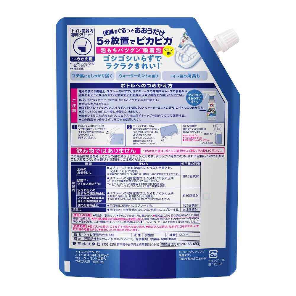 花王株式会社、kao、マジックリン、トイマジ、こすらずスッキリ、泡パック、トイレ、トイレ掃除、トイレの洗剤、洗剤、こすらない、つけ置き、つけ置き洗浄、泡、泡スプレー、パック、汚れ、黒ずみ、消臭、防臭、除菌、洗浄、臭わない、ウォーターミント、ミント、詰替、詰替え、つめかえ、レフィル、入替、いれかえ、ストック