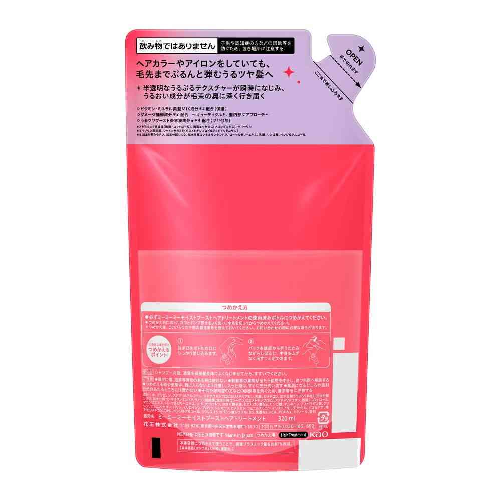 ●次世代型※1 ●爆発的になじむトリートメント ●UP! ME BLEND レッドキウイ×フリージアの香り ●ヘアカラーやアイロンをしていても、毛先までぷるんと弾むうるツヤ髪へ ●半透明なうるぷるテクスチャーが瞬時になじみ、うるおい成分が毛束の奥に深く行き届く ●ビタミン・ミネラル美髪MIX成分※2 配合(保湿) ●ダメージ補修成分※3 配合 ~キューティクルと、髪内部にアプローチ~ ●うるツヤブースト美容液成分α※4 配合(ツヤ付与) ※1当社比 ※2 ビタミンE誘導体(酢酸トコフェロール)、海藻エッセンス(マコンブエキス)、グリセリン ※3 ラノリン脂肪酸、シャインセラミド(ビスメトキシプロピルアミドイソドコサン) ※4 加水分解ケラチン、加水分解シルク、加水分解コンキオリンタンパク、ローヤルゼリーエキス、乳酸、リンゴ酸、ベンジルアルコール