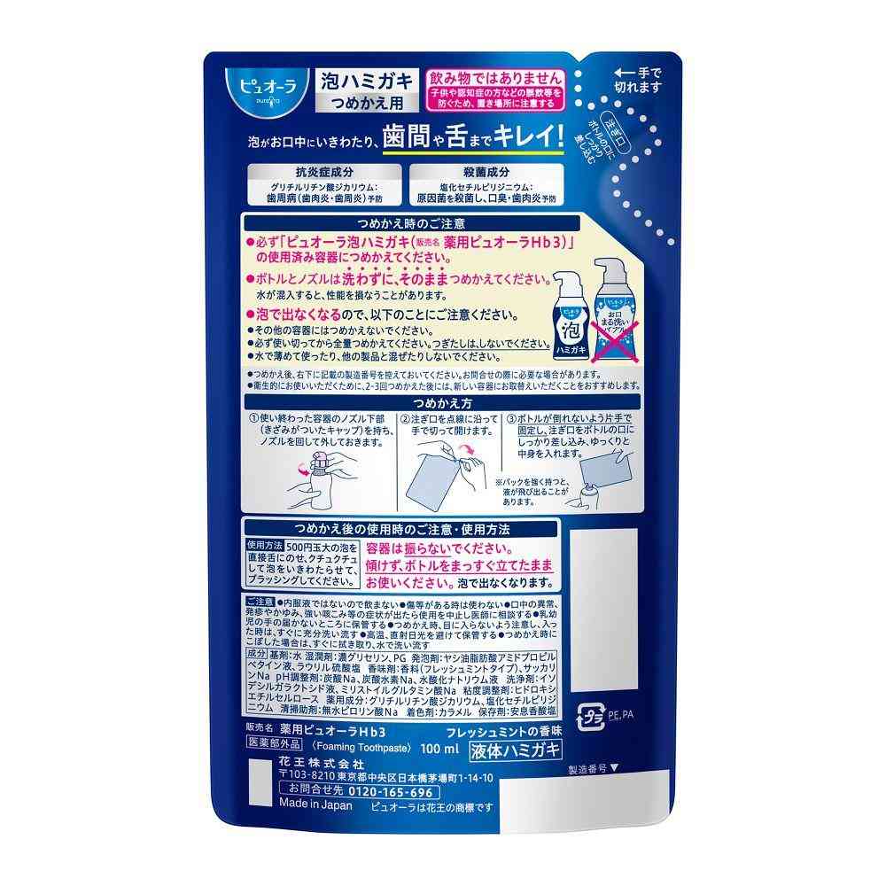花王株式会社、kao、ピュオーラ、泡ハミガキ、フレッシュミント、ハミガキ、はみがき、ハブラシ、オーラルケア、マウスケア、泡、液体ハミガキ、口臭、除菌、歯、節水、水が少ない、防災、緊急時、避難用、詰替、詰替え、詰め替え、つめかえ、レフィル