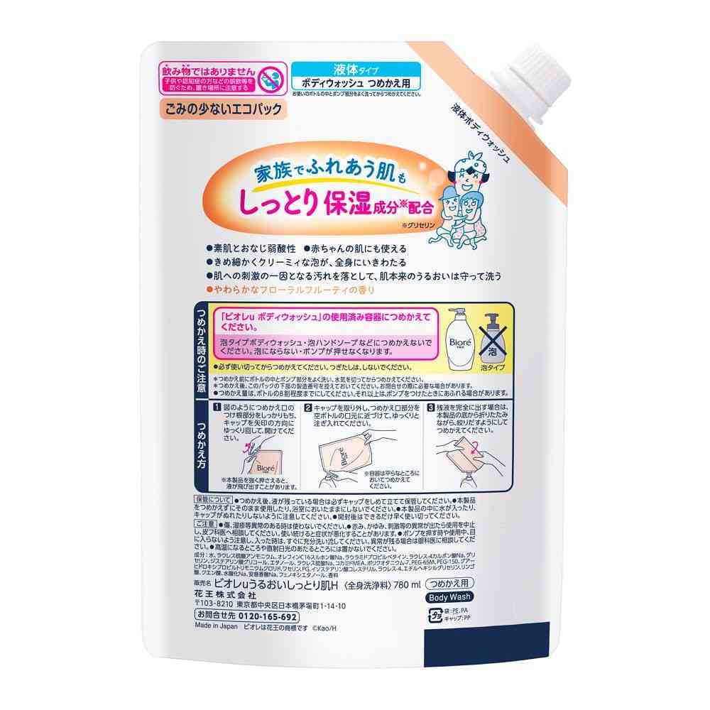 つめかえ用通常サイズ(320ml)の約2.4回分(780ml) 家族でふれあう肌もしっとり保湿成分※配合 ※グリセリン ●素肌とおなじ弱酸性 ●赤ちゃんの肌にも使える ●きめ細かくクリーミィな泡が、全身にいきわたる ●肌への刺激の一因となる汚れを落として、肌本来のうるおいは守って洗う ●やわらかなフローラルフルーティの香り
