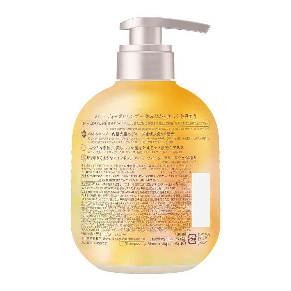 花王、花王グループカスタマーマーケティング、KAO、ヘアケア、メルト、melt、ディープ、蓄積、ダメージ、補修、髪ストレス、ナノ浸透ケア、ツヤ髪、しなやか、ウォーターリリー、ウッド、天然精油、シャンプー、本体、ボトル