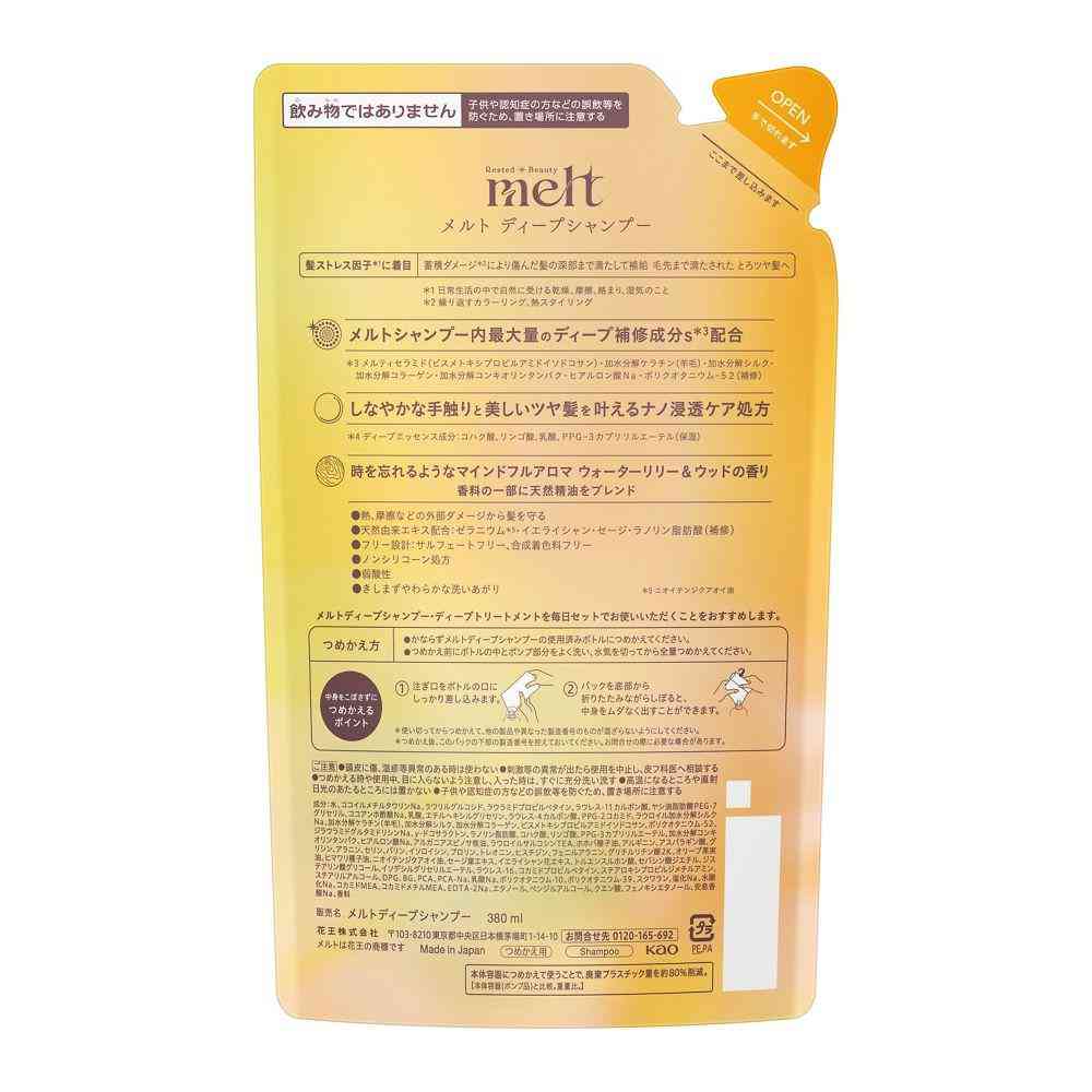 花王、花王グループカスタマーマーケティング、KAO、ヘアケア、メルト、melt、ディープ、蓄積、ダメージ、補修、髪ストレス、ナノ浸透ケア、ツヤ髪、しなやか、ウォーターリリー、ウッド、天然精油、シャンプー、詰替、詰替え、詰め替え、つめかえ、レフィル