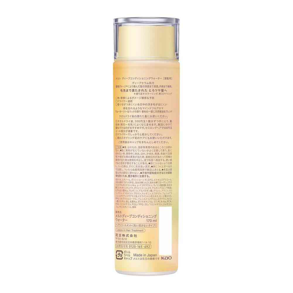 花王、花王グループカスタマーマーケティング、KAO、ヘアケア、メルト、melt、ディープ、蓄積、ダメージ、補修、髪ストレス、ナノ浸透ケア、ツヤ髪、しなやか、ウォーターリリー、ウッド、天然精油、トリートメント、洗い流さない、アウトバス、髪の化粧水、コンディショニングウォーター