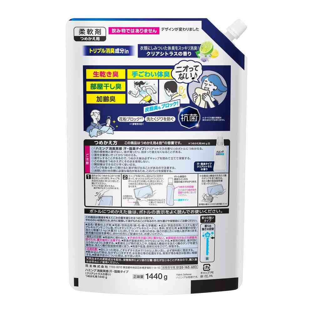花王、ハミング、消臭、実感、柔軟剤、洗濯、ソフター、衣類、洗剤、芳香、柔らか、香り、ふわふわ、デオドラント、クリア、シトラス、汗、脂、臭い、ニオイ、詰替、詰替え、詰め替え、つめかえ、レフィル