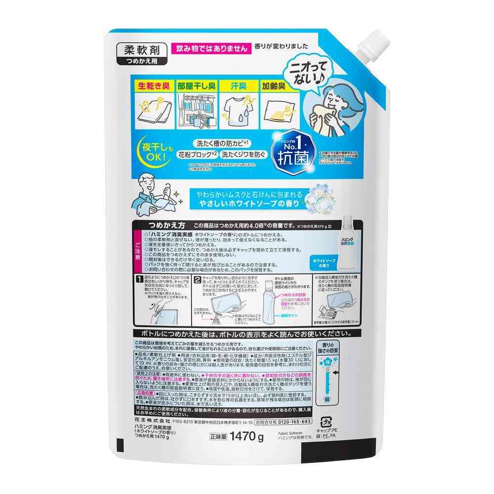 花王、ハミング、消臭、実感、柔軟剤、洗濯、ソフター、衣類、洗剤、芳香、柔らか、香り、ふわふわ、デオドラント、ホワイト、ソープ、せっけん、詰替、詰替え、詰め替え、つめかえ、レフィル