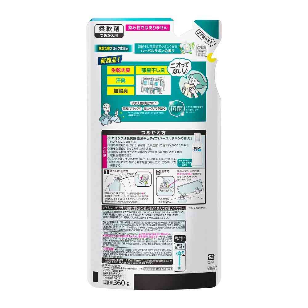 花王、ハミング、消臭、実感、柔軟剤、洗濯、ソフター、衣類、洗剤、芳香、柔らか、香り、ふわふわ、デオドラント、部屋干し、生乾き、ハーバル、サボン、詰替、詰替え、詰め替え、つめかえ、レフィル