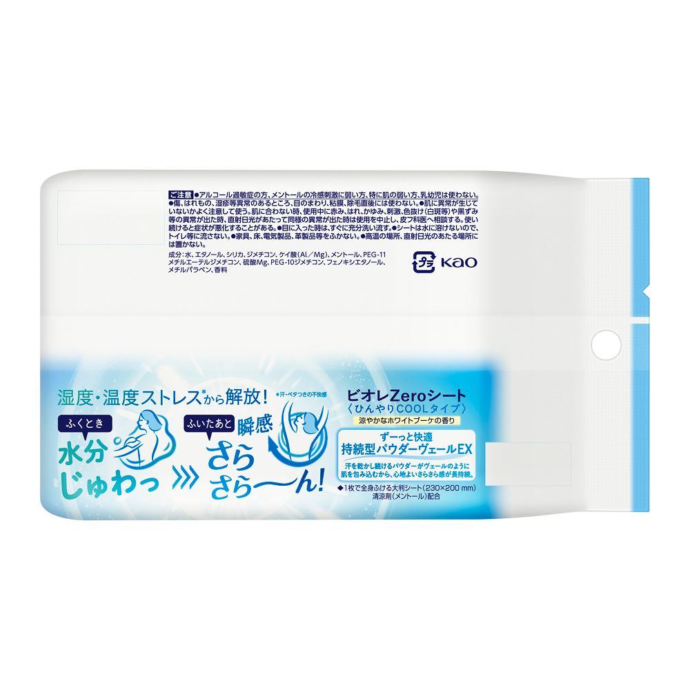汗やベタつきによる湿度・温度ストレスから解放! ふくとき、水分じゅわっ ふいたあと、瞬間さらさら~ん! ずーっと快適持続型パウダーヴェールEX 汗を乾かし続けるパウダーがヴェールのように肌を包み込むから、心地よいさらさら感が長持続 1枚で全身ふける大判シート(230×200mm) 清涼剤(メントール)配合