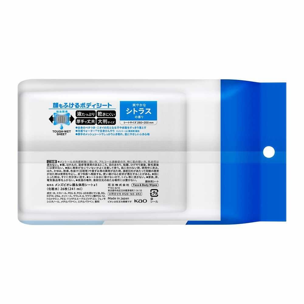 顔もふけるボディシート 液たっぷり 厚手で丈夫 乾きにくい 大判サイズ 爽やかなシトラスの香り ●全身のベタつき・ニオイの元となる汗や皮脂をすっきり落とす ●冷感ウォーター※で全身ひんやり ※メントール(清涼剤)配合 ●厚手のメッシュシートでしっかりふき取れ、肌にやさしいふき心地