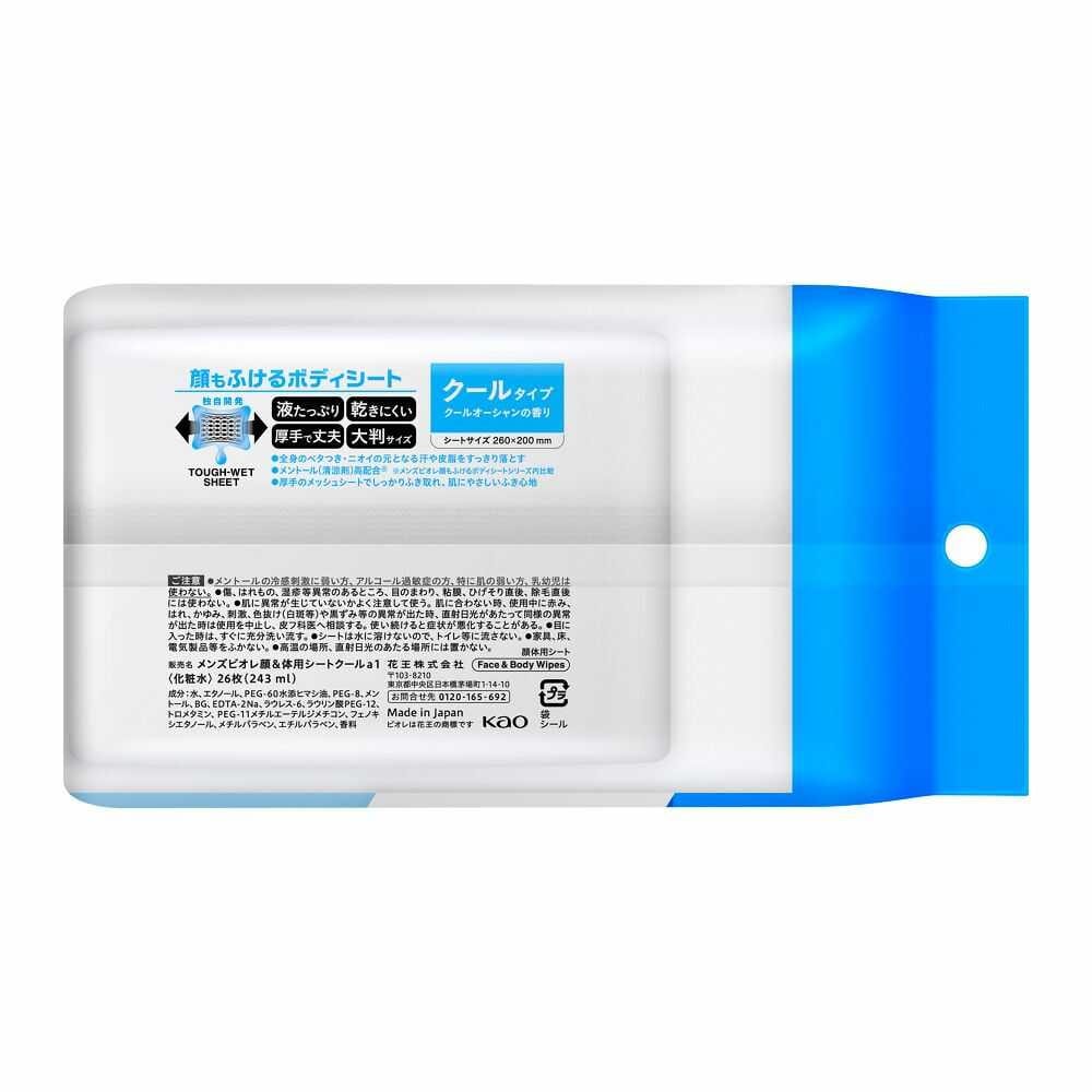 顔もふけるボディシート 液たっぷり 厚手で丈夫 乾きにくい 大判サイズ クールタイプ クールオーシャンの香り ●全身のベタつき・ニオイの元となる汗や皮脂をすっきり落とす ●メントール(清涼剤)高配合※ ※メンズビオレ顔もふけるボディシートシリーズ内比較 ●厚手のメッシュシートでしっかりふき取れ、肌にやさしいふき心地