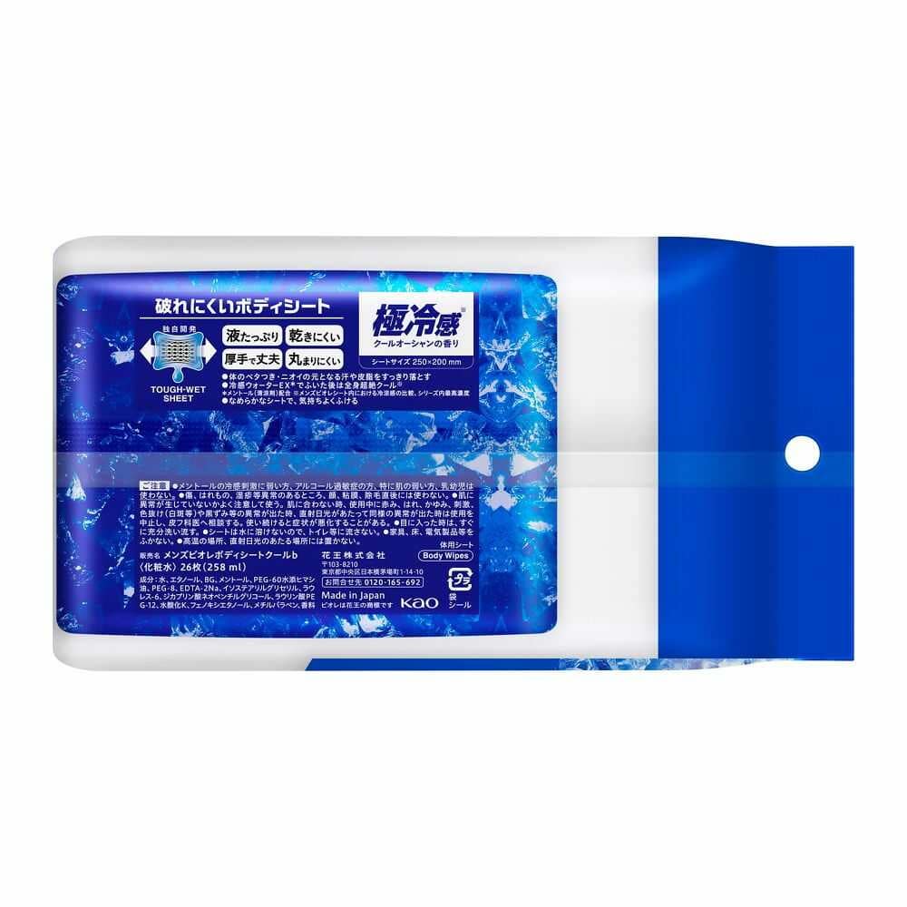 破れにくいボディシート 液たっぷり 厚手で丈夫 乾きにくい 丸まりにくい 極冷感※ ※メントール(清涼剤)配合 クールオーシャンの香り ●体のベタつき・ニオイの元となる汗や皮脂をすっきり落とす ●冷感ウォーターEX※でふいた後は全身超絶クール※ ※メンズビオレシート内における冷涼感の比較、シリーズ内最高濃度 ●なめらかなシートで、気持ちよくふける