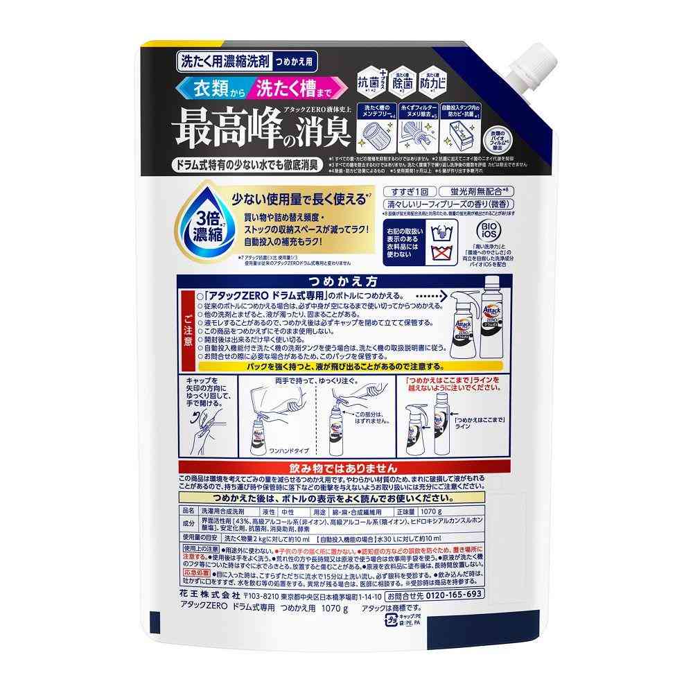 花王、花王グループカスタマーマーケティング、KAO、アタック、ATTACK、attack、ZERO、zero、ゼロ、洗濯洗剤、衣料用洗剤、液体洗剤、コンパクト洗剤、除菌、抗菌、消臭、節水、すすぎ1回、ドラム、専用洗剤、詰替、詰替え、詰め替え、つめかえ、レフィル