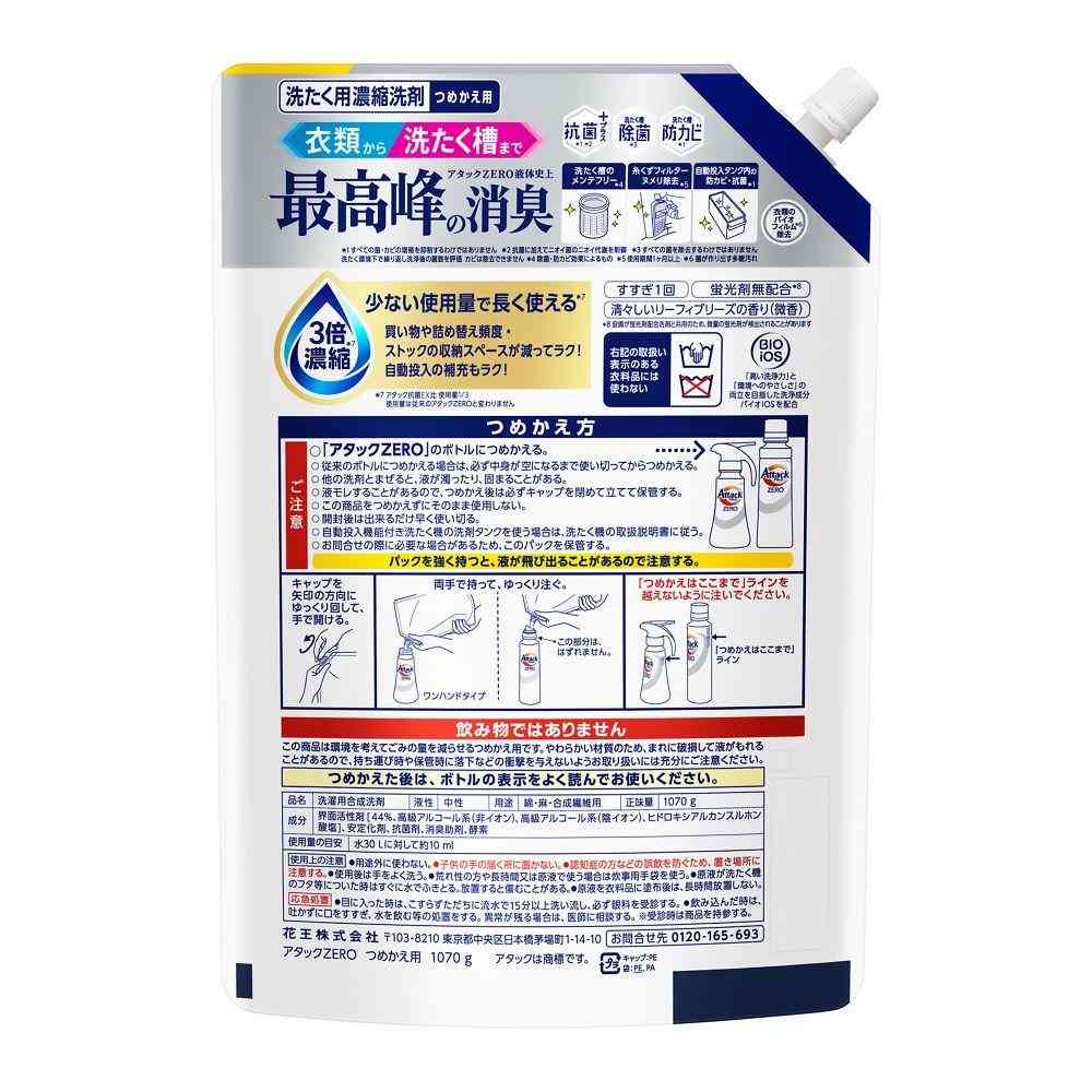 花王、花王グループカスタマーマーケティング、KAO、アタック、ATTACK、attack、ZERO、zero、ゼロ、洗濯洗剤、衣料用洗剤、液体洗剤、コンパクト洗剤、除菌、抗菌、消臭、節水、すすぎ1回、詰替、詰替え、詰め替え、つめかえ、レフィル