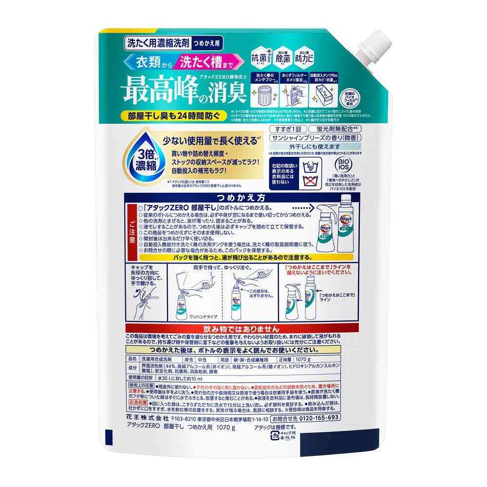 花王、花王グループカスタマーマーケティング、KAO、アタック、ATTACK、attack、ZERO、zero、ゼロ、洗濯洗剤、衣料用洗剤、液体洗剤、コンパクト洗剤、除菌、抗菌、消臭、節水、すすぎ1回、部屋干し、詰替、詰替え、詰め替え、つめかえ、レフィル