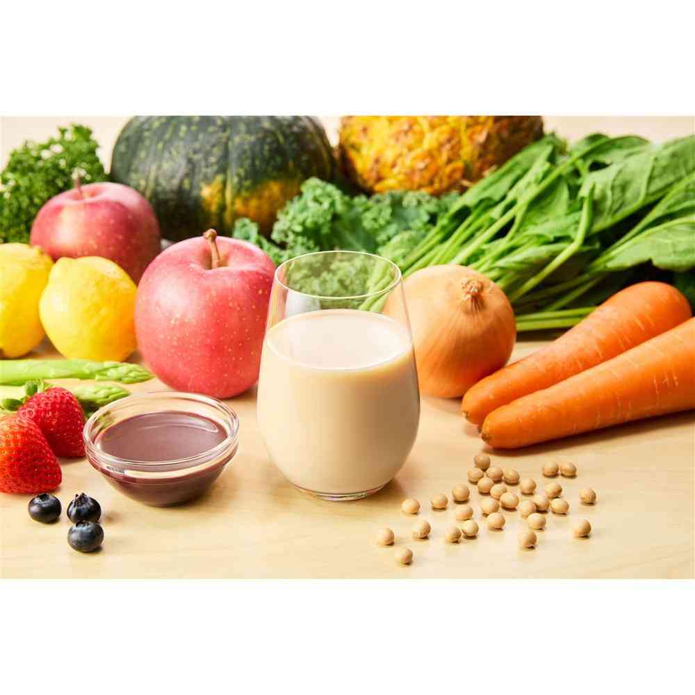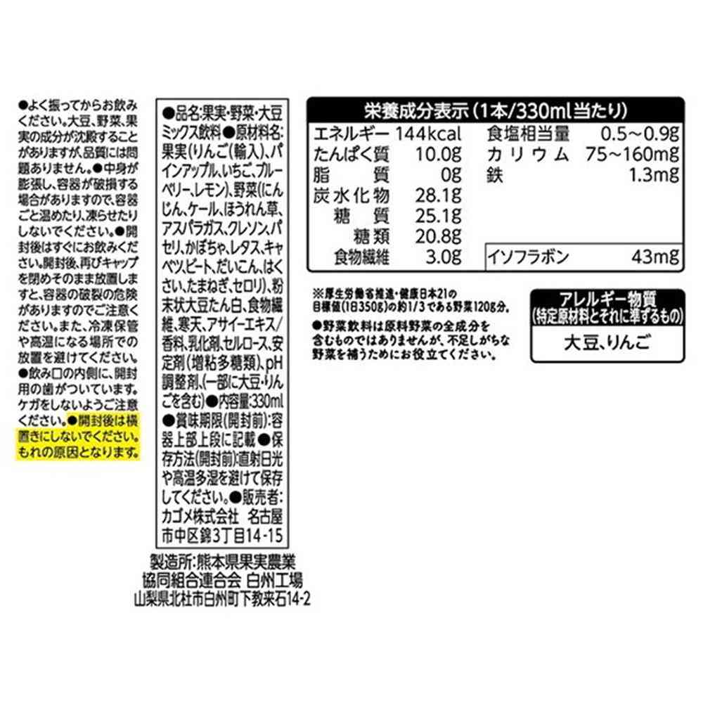 ■原材料名 果実(りんご(輸入)、パインアップル、いちご、ブルーベリー、レモン)、野菜(にんじん、ケール、ほうれん草、アスパラガス、クレソン、パセリ、かぼちゃ、レタス、キャベツ、ビート、だいこん、はくさい、たまねぎ、セロリ)、粉末状大豆たん白、食物繊維、寒天、アサイーエキス/香料、乳化剤、セルロース、安定剤(増粘多糖類)、pH調整剤、(一部に大豆・りんごを含む) ■栄養成分 1本(330ml)あたり エネルギー144kal たんぱく質10.0g 脂質0g 炭水化物28.1g 糖質25.1g 食物繊維3.0g 食塩相当量0.5~0.9g