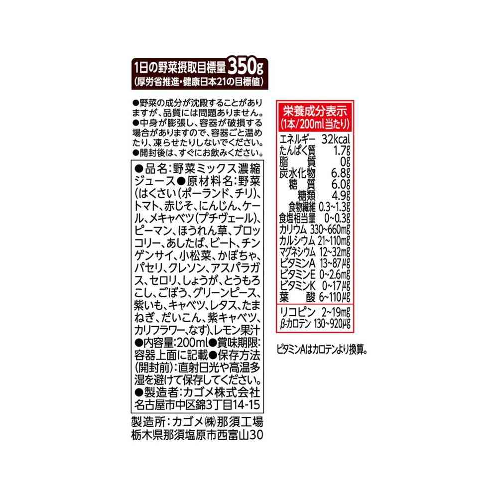 ■原材料名 野菜(はくさい(ポーランド、チリ)、トマト、赤じそ、にんじん、ケール、メキャベツ(プチヴェール)、ピーマン、ほうれん草、ブロッコリー、あしたば、ビート、チンゲンサイ、小松菜、かぼちゃ、パセリ、クレソン、アスパラガス、セロリ、しょうが、とうもろこし、ごぼう、グリーンピース、紫いも、キャベツ、レタス、たまねぎ、だいこん、紫キャベツ、カリフラワー、なす)、レモン果汁 ■栄養成分 1本(200ml)あたり エネルギー32kal たんぱく質1.7g 脂質6.0g 炭水化物6.8g 糖質4.9g 食物繊維0.3g 食塩相当量0~0.3g