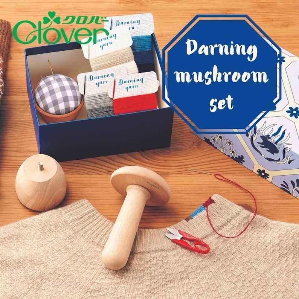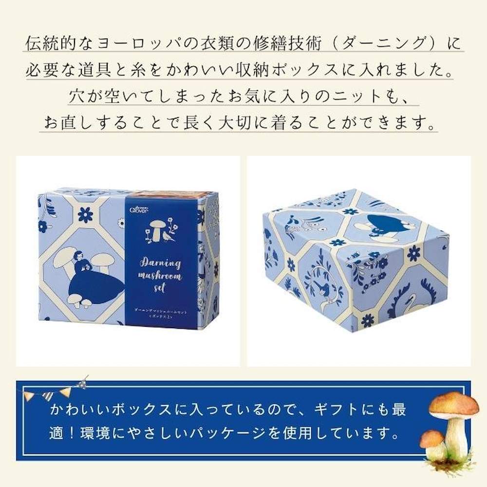 ダーニングに必要な道具と糸のセット。伝統的なヨーロッパの衣類の修繕技術(ダーニング)に必要な道具と糸をかわいい収納ボックスに入れました。まとめておけるので、いつでもダーニングが楽しめます。ギフトにもおすすめ。セットにはダーニング糸が3色巻×4種類入っているので、すぐにダーニングが楽しめます。ダーニングとは、ヨーロッパで伝統的に行われている、衣類の穴あきやすりきれた箇所を修繕する針仕事です。そんなダーニングの作業に欠かせないのが、キノコ型の道具、ダーニングマッシュル-ム。土台が付け替え式なので、手で持っても、テーブルに置いてもダーニングが楽しめます。穴が空いてしまったお気に入りのニットも、お直しすることで長く大切に着ることができます。サトウキビ(非木材資源)から作られた、バガスパルプ配合の環境にやさしいパッケージを採用しています。※リングゴムはラテックスアレルギーなど、体質にあわないことがありますのでご注意ください。