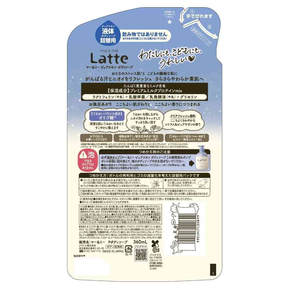 マー&ミー、ラッテ、ミルク、プロテイン、オリゴ糖、セラミド、酵母エキス、ママ、こども、うるおい、やさしいふんわり泡、アミノ酸系、汗、皮脂、すっきり、ニオイ、リフレッシュ、クリアフレッシュ香料、シトラス、ピュアサボン、ボディソープ、せっけん、親子、全身洗浄料、詰め替え用
