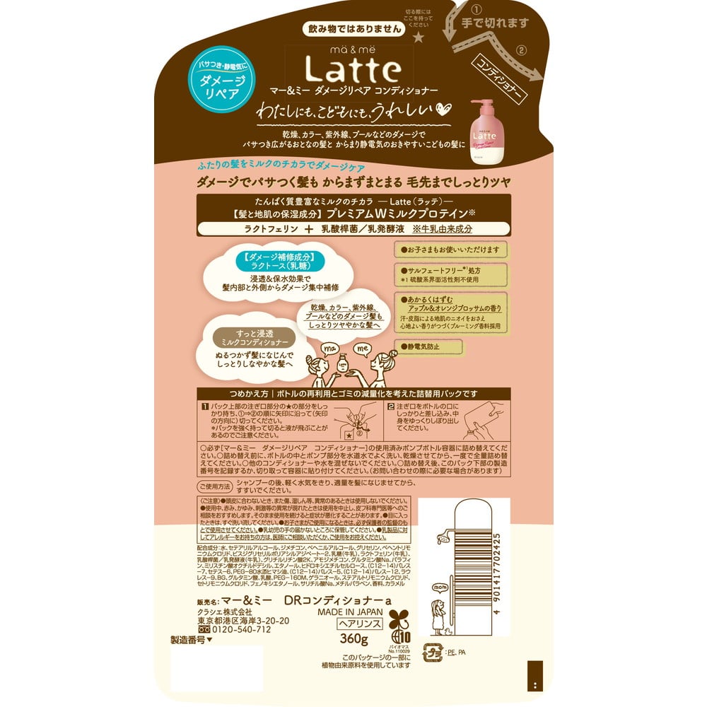 ○ダメージでパサつくおとなの髪と、静電気のおきやすいこどもの髪に○髪と地肌の保湿成分プレミアムWミルクプロテイン配合○ダメージ補修成分ラクトース配合○毛先までしっとりツヤ、からまずまとまる○ぬるつかないミルクコンディショナー○髪内部と外側からダメージ集中補修○地肌のニオイをおさえるブルーミング香料採用○あかるくはずむアップル&オレンジブロッサムの香り○サルフェートフリー○こどもと一緒に使える