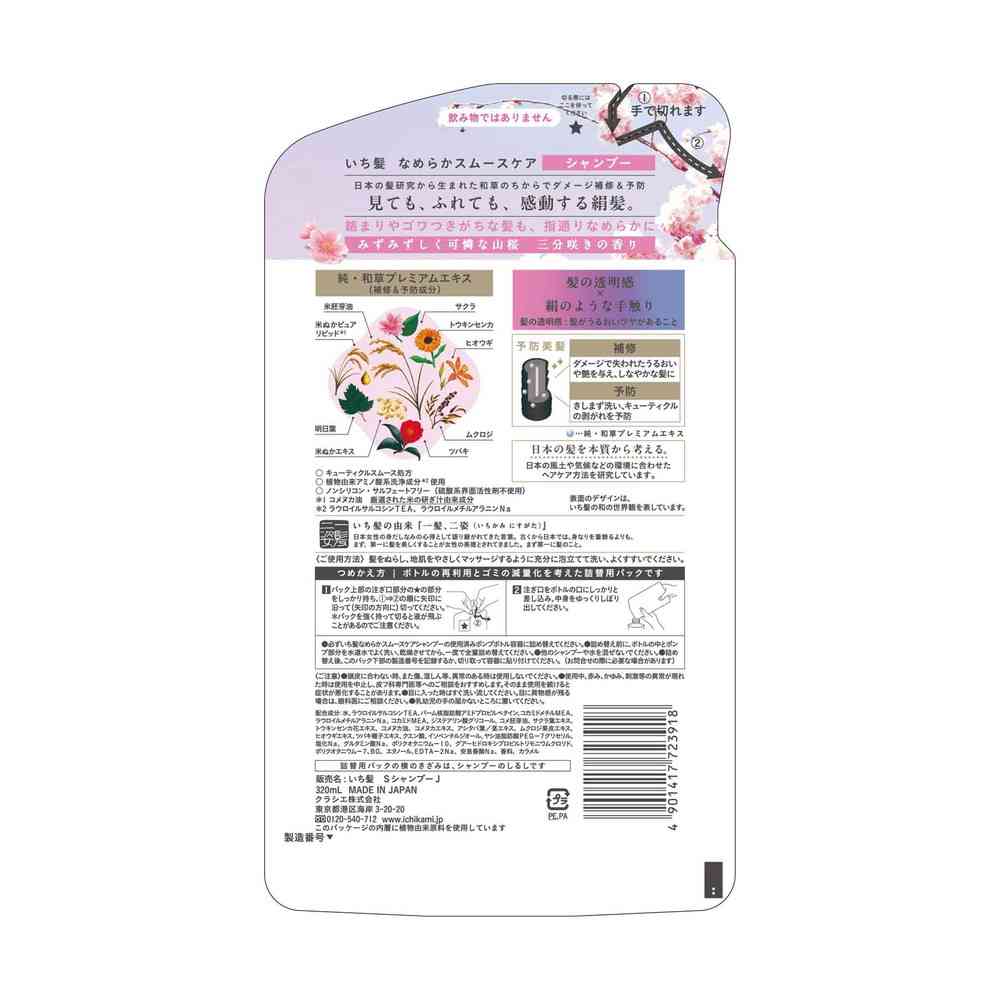 ●日本の髪を本質から考える。 ●日本の髪研究から生まれた和草のちからでダメージ補修&予防します ●髪の透明感と絹のような手触り ●補修&予防成分「純・和草プレミアムエキス」配合 ●キューティクルスムース処方 ●植物由来アミノ酸系洗浄成分使用 ●ノンシリコン・サルフェートフリー処方 ●みずみずしく可憐な山桜三分咲きの香り ●絡まりやゴワつきがちな髪も、指通りなめらか