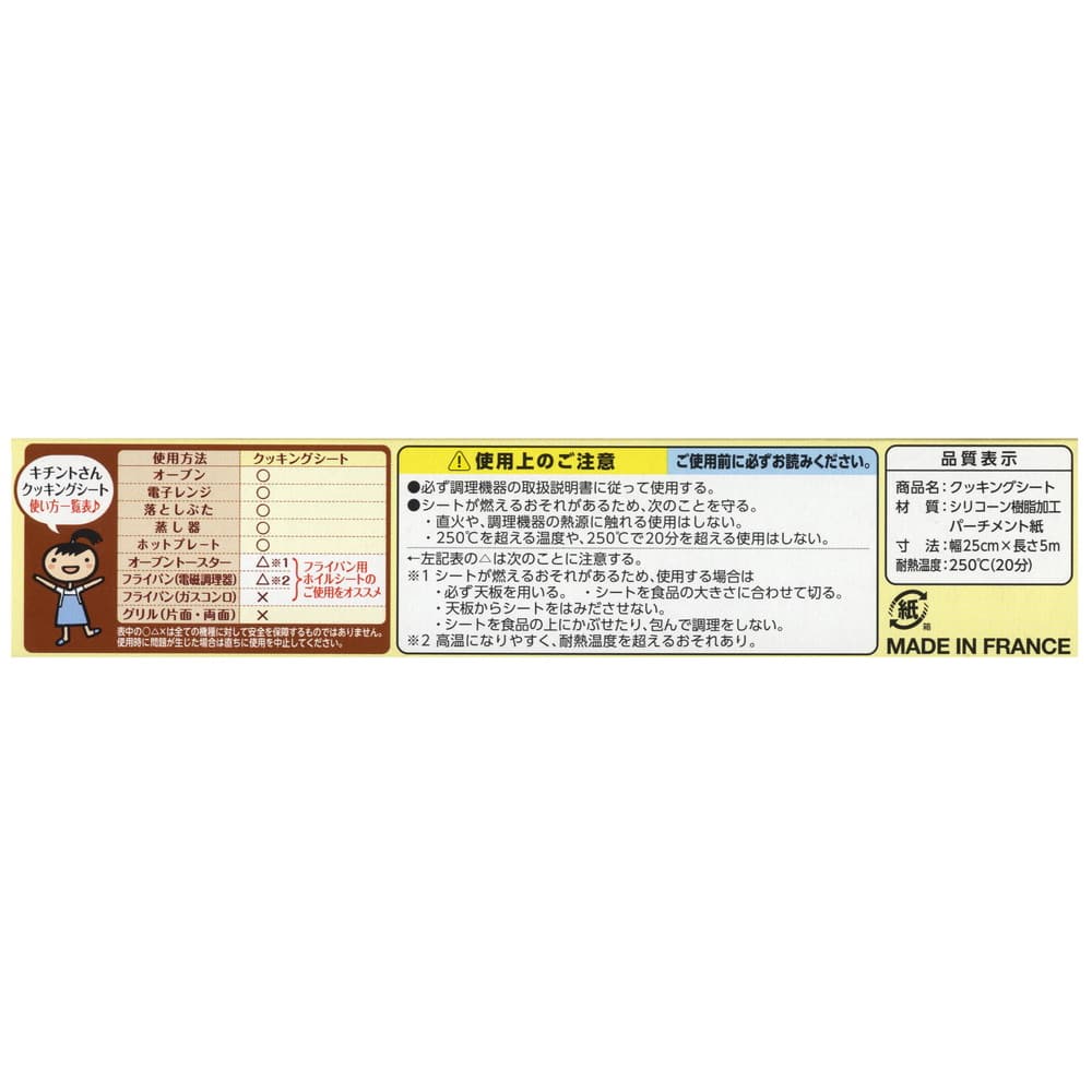 シートが燃える恐れがあるため直火や調理機器の熱源に触れる使用はしないでください。 250度を超える温度や、250度で20分を超える使用はしないでください。 フライパン、グリルでの使用はお控えください。