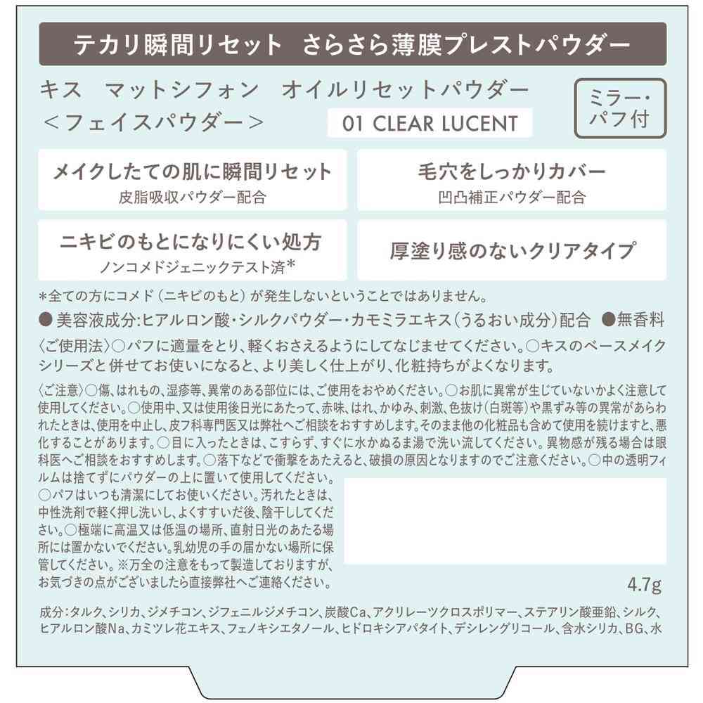 テカリ・毛穴を瞬間リセット いつでもさらさら肌を叶えるkissの薄膜プレストパウダー いつでもさらさら肌を叶えるプレストタイプのフェイスパウダー。 薄膜で厚塗り感のないナチュラルな仕上がりなのに、毛穴もしっかりカバーして均一な美肌を叶えます。 容器がコンパクトで持ち運びやすく、さっと簡単にお直しが可能です。 キス kiss