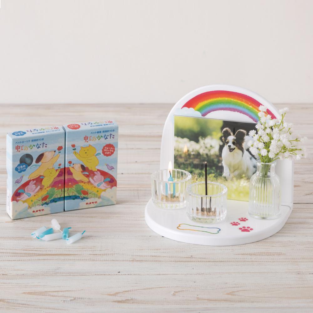 ペット(家族)を失った飼い主の悲しみに寄り添う「祈り」のステージ、役割を十分に果たすペットメモリアルの「オールインワンセット」。 セット内容:木製フォトステージ1台、T86200001S_ペットローソク1函、I23040001_ペット線香1函、デコレーションシール1シート、金の雲型ローソク立て1個、PE3320000W_金の雲型香立て、SJ5450000_ガラスの器2個、花立て1個、滑り止めシール1シート