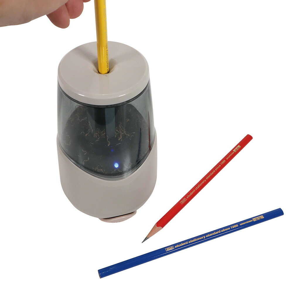 リビングにマッチ!学習に最適な充電式鉛筆けずり。 空気の力でくっつく吸盤付で倒れない。 リチウムイオン電池内蔵、1回のフル充電で200回以上削れる(充電時間120分)。 速削り約3.5秒(芯折れ鉛筆を削った時)、新品鉛筆は約6秒。 安全設計(オーバーヒート防止機能付、ムダ削り防止機能付)。