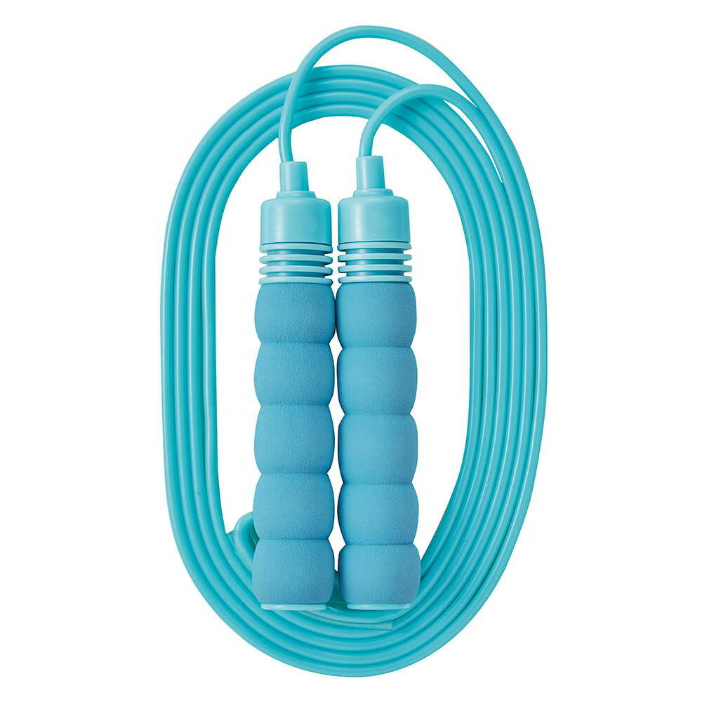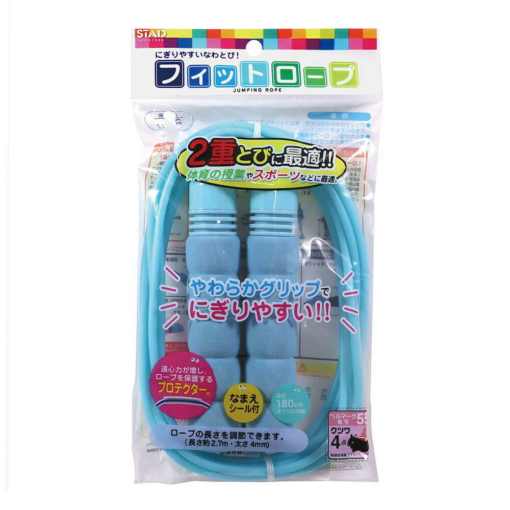 やわらかグリップが手にフィットする! 跳びやすいなわとび。 ロープの保護と遠心力が増すプロテクター付きです。 跳びやすい長さに調節できるロープ。 ロープの長さは2.7m。