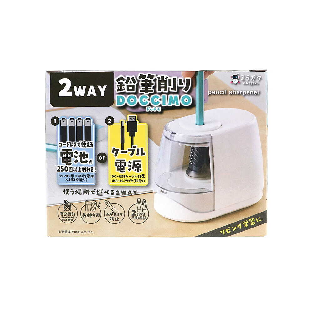 電動、鉛筆削り、ドッチモ、ケーブル電源、乾電池、単三電池、安全設計、オーバーヒート防止、三角軸、丸軸、六角軸、鉛筆、芯先調節、ムダ削り防止