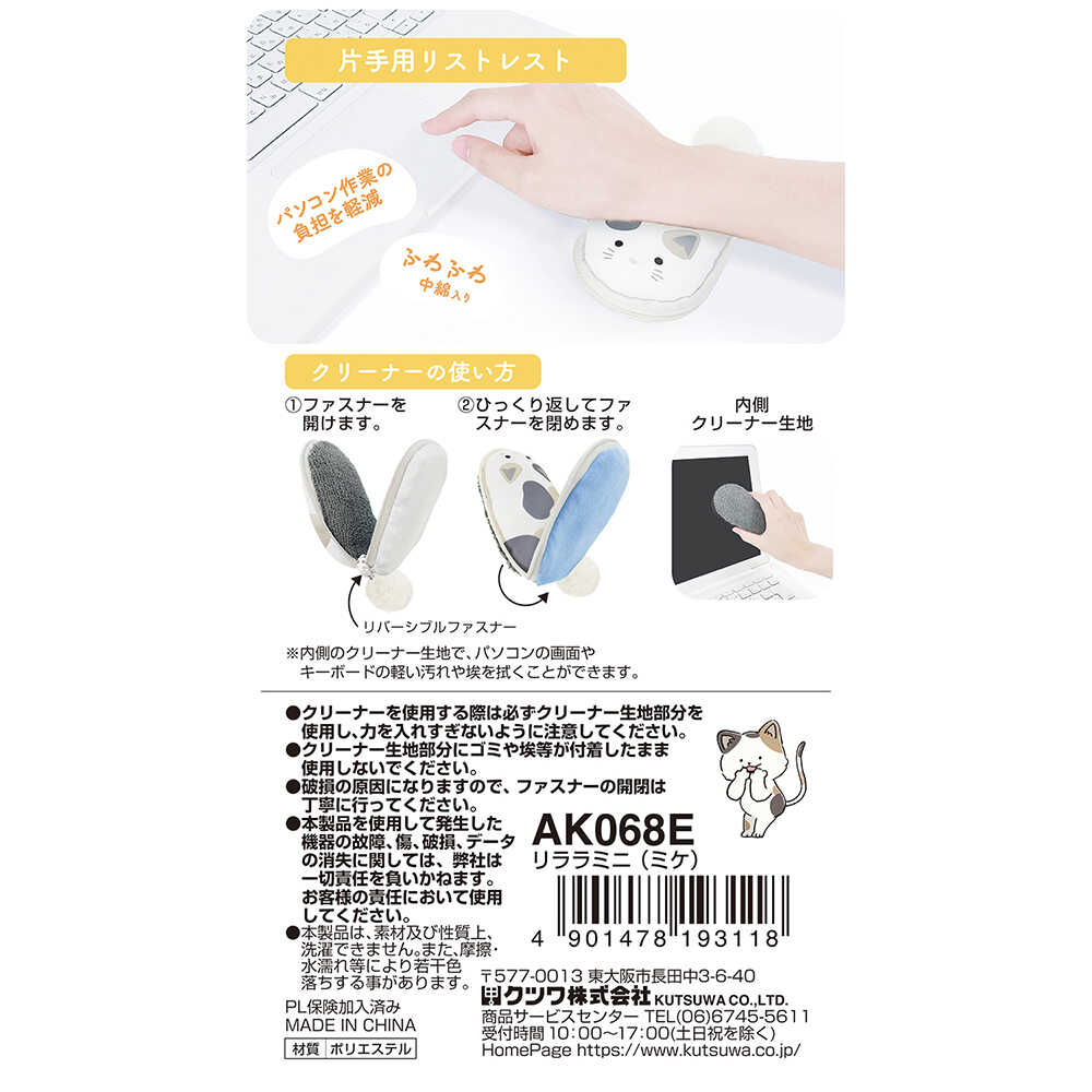リストレスト、ミケ、ミニサイズ、かわいい、動物、デザイン、片手用、パソコンワーク、負担軽減、手首、やわらげる、小さい動物、モチーフ、中綿、クッション性、高い、ふんわり、やわらかな、触り、心地、底面、合成生地、すべりにくい、リバーシブル、ファスナー、ひっくり返す、画面、キーボード、クリーナー、キレイ、便利、お掃除、グッズ