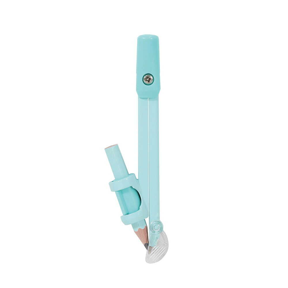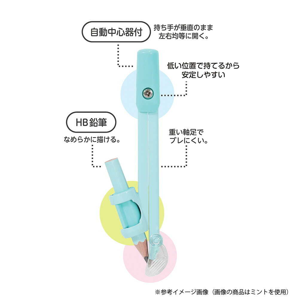 算数教科書対応!カラフルで回しやすい算数コンパス。 「人間工学ヘッド」で回しやすく、ホルダーのつまみを回すと簡単に固定できる、安全な針カバー付きのコンパスです。 回す工程において、三角形から円形へ変化する太軸のグリップ形状。 三角形の根元を3点でつかむと安定して円を描き始められ、途中から後半にかけて先端の円形の持ち手をつかんで回すことでクルッと自然に回すことができます。(最大直径30cm) かんたん鉛筆固定ホルダー付きで、鉛筆ホルダーのつまみを左に回すとゆるみ、右に回すと鉛筆を固定できます。 使わない時は針と鉛筆の芯先をおおって安全。 紛失しない開閉式の針カバーです。