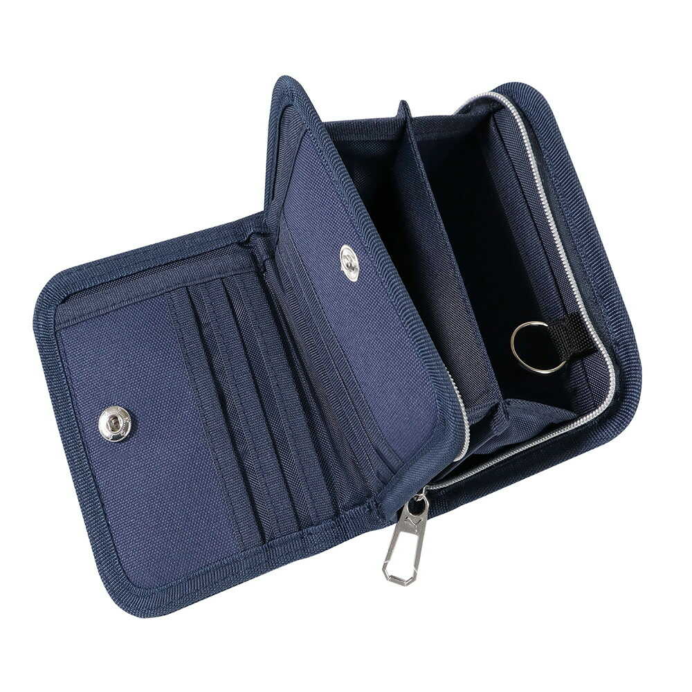 小銭入れが大きく開いて出し入れしやすく、カード入れも充実したPUMAウォレット。 ストラップの長さを調節してショルダーベルトやウォレットチェーンとして持ち方を選べます。 札入、カード入部分は、ホック仕様で開けやすく、小銭入はファスナーを全開にすると大きく開いて使いやすいです。 ポケット数は札入1室、小銭入2室、カード入8室(6室+2室)、内側にキーリング付きです。