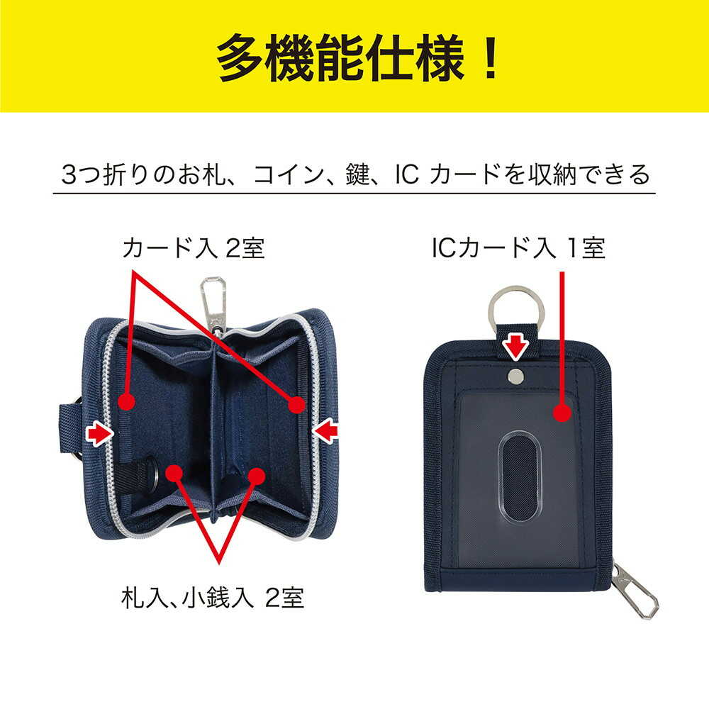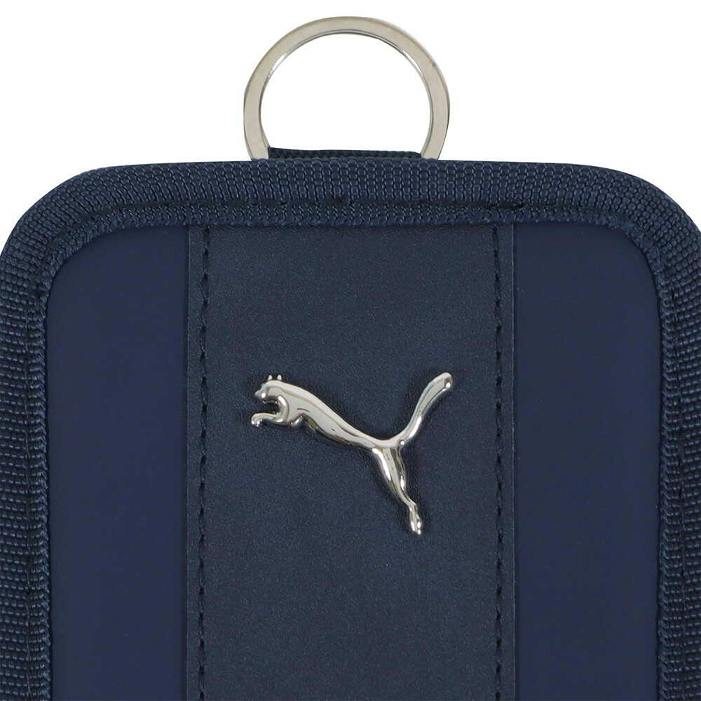 ICカード入れと小銭入れ付きのPUMAウォレット。 ストラップの長さを調節してショルダーベルトやウォレットチェーンとして持ち方を選べます。 縦型で小銭入れが2ポケットあり、ファスナーを全開にすると大きく開いて使いやすいです。 お札は三つ折りで収納できます。 ICカード入れにはカードの落下紛失予防ホックが付いています。 ポケット数は札入・小銭入2室(お札は3つ折りで収納可能)、カード入3室(2室+ICカード入1室)、内側にキーリング付きです。