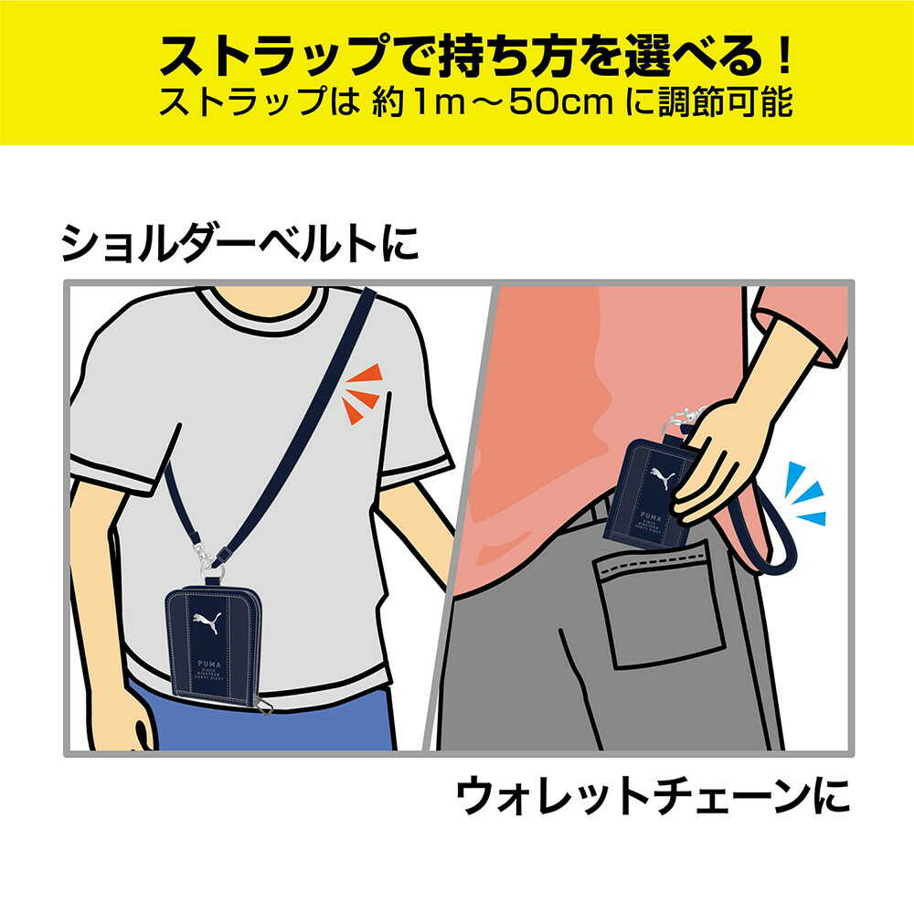 ウォレット、PUMA、ICカード入れ、小銭入れ、ストラップ、長さ調節、ショルダーベルト、ウォレットチェーン、縦型、小銭入れ2ポケット、お札三つ折り収納、カード落下紛失予防ホック付き、ポケット数、札入、小銭入2室、(お札は3つ折りで収納可能)、カード入3室、(2室+ICカード入1室)キーリング
