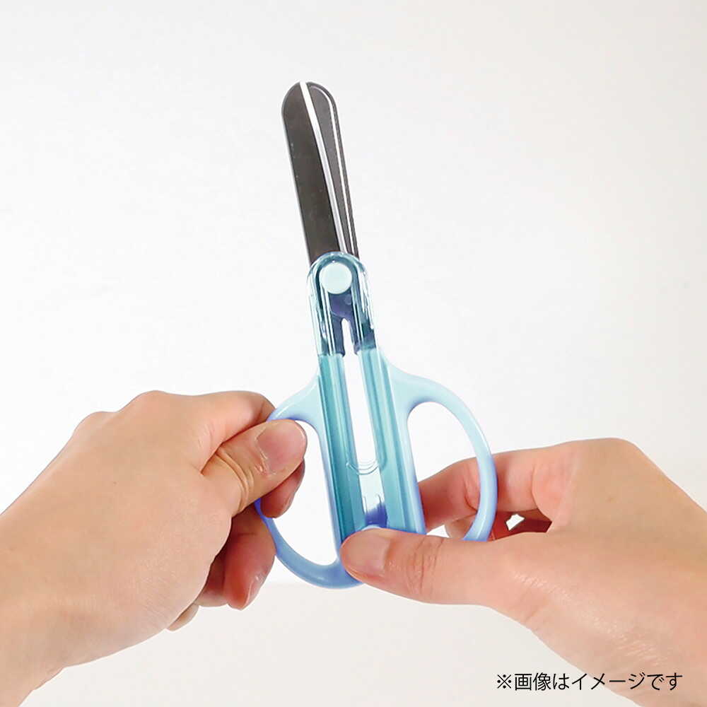 キャップ一体型はさみ、なくす、困りごと、ハサミ、スライドキャップ、ロック、安全、牛乳パック、ペットボトル、サクサク切れる、刃先丸い、のりがつきにくい刃、左手用、水色