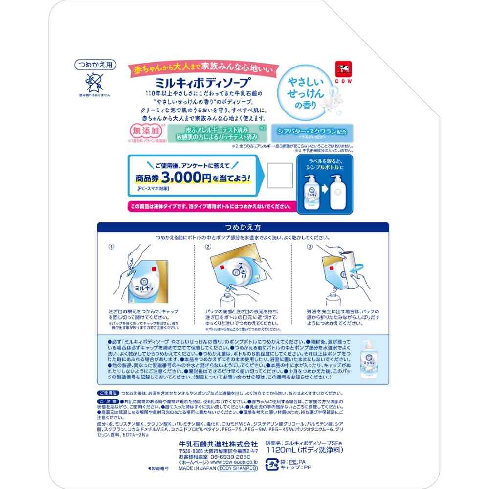 牛乳、石鹸、せっけん、ミルキィ、ミルキー、カウブランド、ボディ、ソープ、体、身体、洗浄料、全身洗浄料、液体、詰替、つめかえ、詰め替え、コスパ、大容量、家族、ファミリー