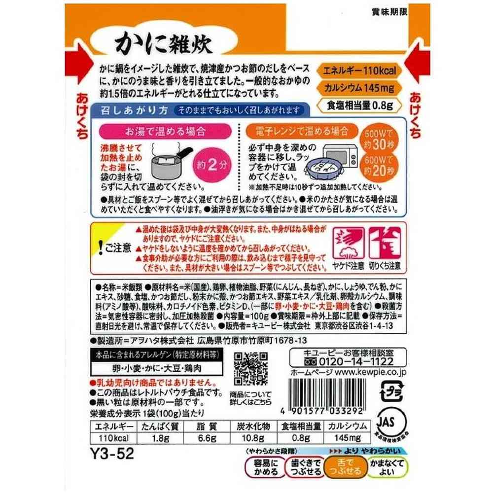 米(国産)、鶏卵、植物油脂、野菜(にんじん、長ねぎ)、かに、しょうゆ、でん粉、かにエキス、砂糖、食塩、かつお節だし、粉末かに殻、かつお節エキス、野菜エキス/乳化剤、卵殻カルシウム、調味料(アミノ酸等)、酸味料、カロチノイド色素、ビタミンD、(一部に卵・小麦・かに・大豆・鶏肉を含む) 1袋(100g)当たり エネルギー110kcal、たんぱく質1.8g、脂質6.6g、炭水化物10.8g、食塩相当量0.8g