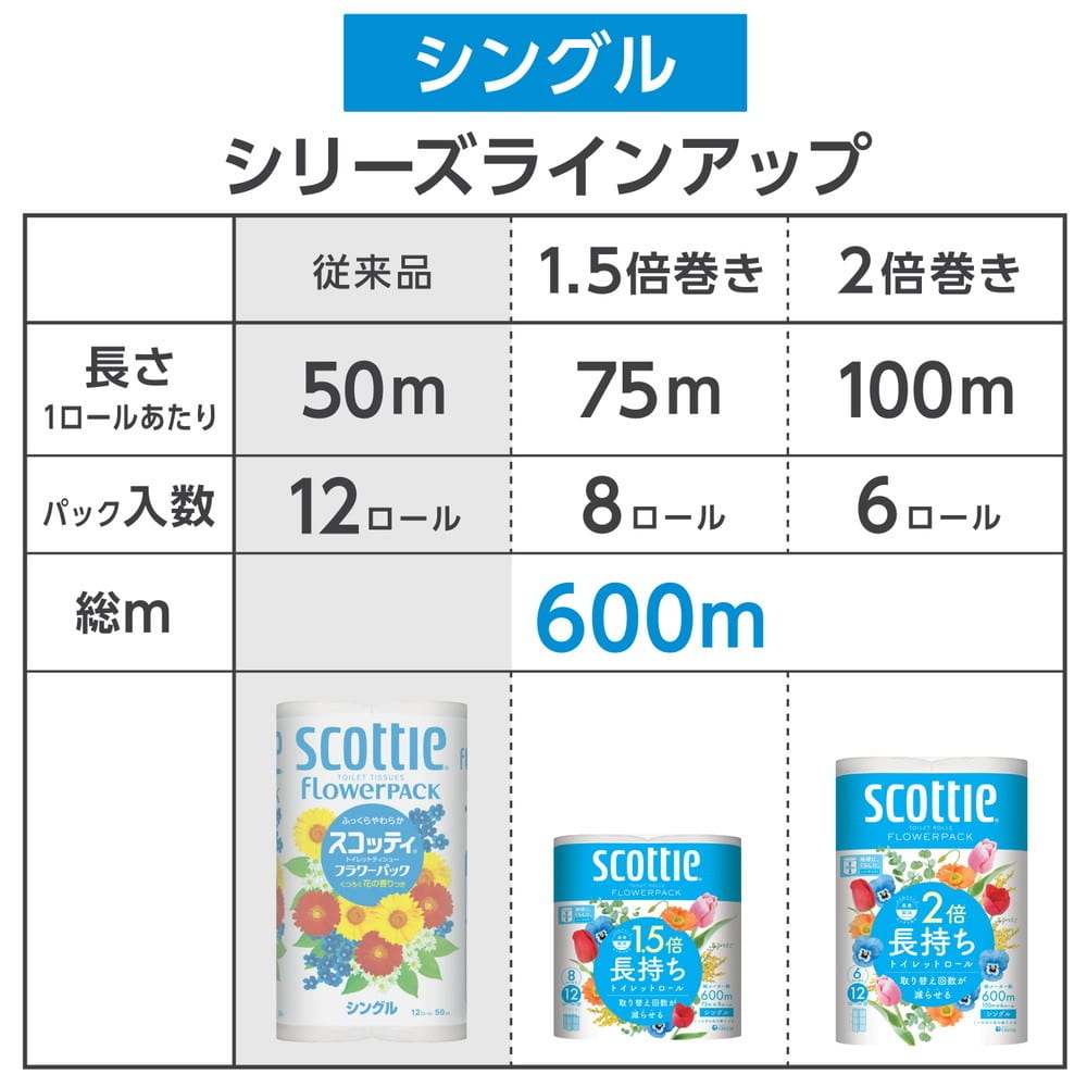 8ロールで12ロール分の長さ※のトイレットロール(シングル) ※従来品スコッティフラワーパック12ロール(シングル)との比較 ・たっぷり使えて取り替えの手間を軽減。 ・省スペース化で保管もスッキリ。 ・家庭用トイレホルダー適応サイズ。 ・くつろぎの花の香りつき。