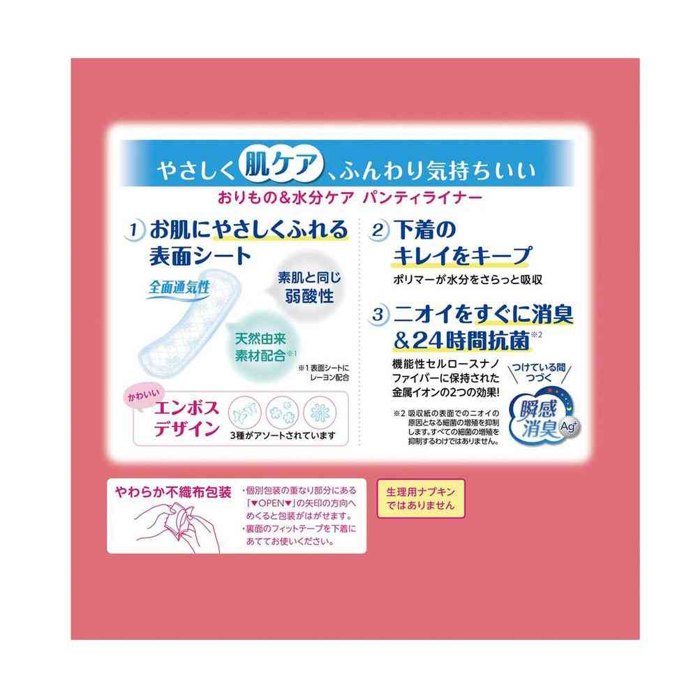 ・表面シートに天然由来素材のレーヨンを配合 ・素肌と同じ弱酸性 ・ポリマーが水分をさらっと吸収し、下着のキレイをキープ ・ニオイをすぐに消臭&24時間抗菌 ・ムレにくい全面通気性 ・無香料 ・入数2倍のまとめ買いパック ・吸収量の目安:10cc ・パッドサイズ:長さ17.5cm