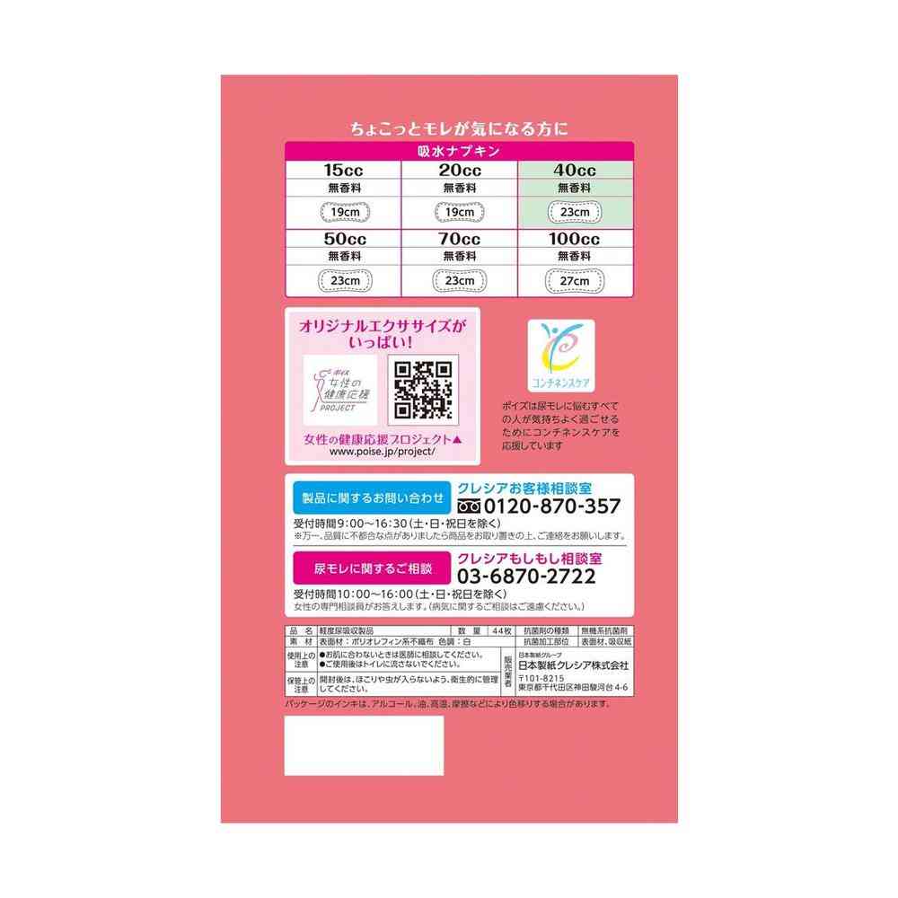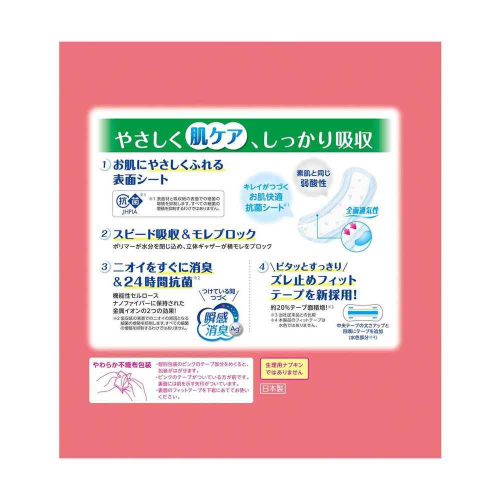 ・ピタッとすっきりズレ止めフィットテープを新採用 ・キレイがつづくお肌快適抗菌シートで肌トラブルを軽減 ・素肌と同じ弱酸性 ・スピード吸収&モレブロック ・ニオイをすぐに消臭&24時間抗菌 ・ムレにくい全面通気性 ・かわいい花柄エンボス ・無香料 ・入数2倍のまとめ買いパック ・吸収量の目安:40cc ・パッドサイズ:長さ23cm