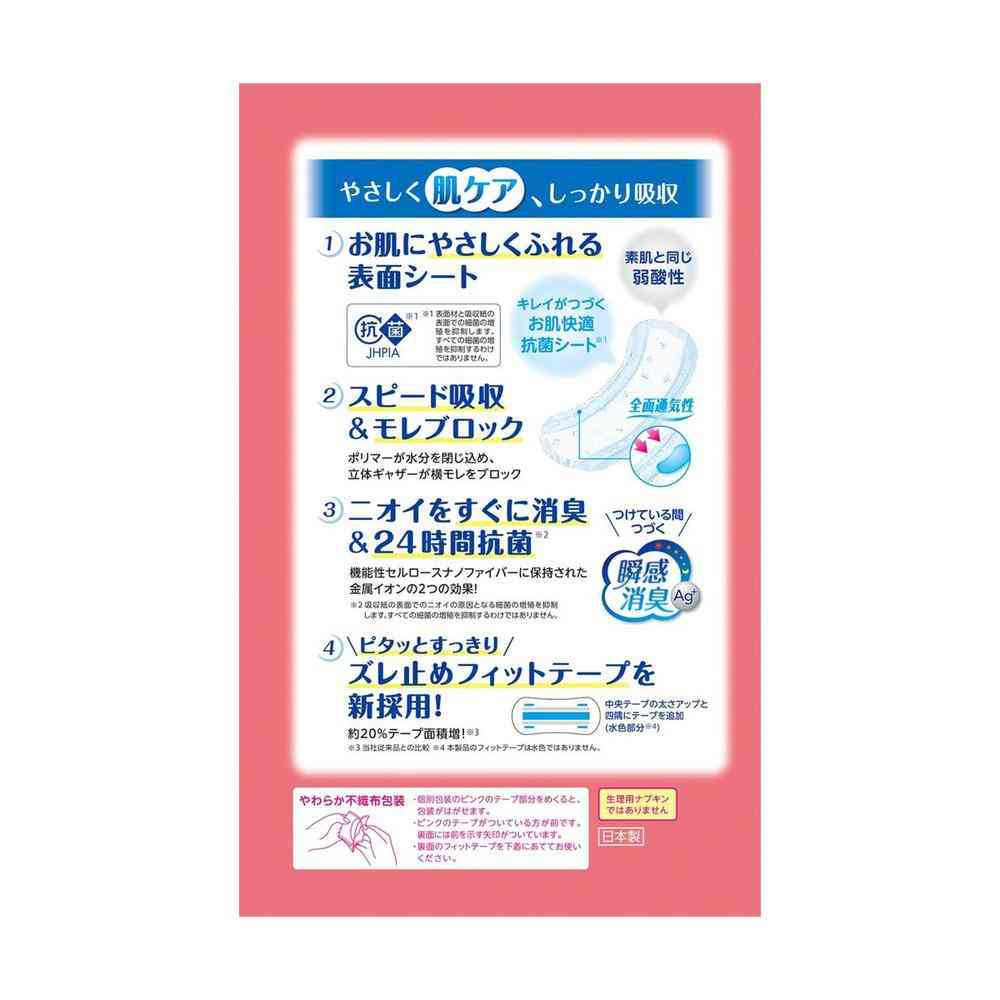 ・ピタッとすっきりズレ止めフィットテープを新採用 ・キレイがつづくお肌快適抗菌シートで肌トラブルを軽減 ・素肌と同じ弱酸性 ・スピード吸収&モレブロック ・ニオイをすぐに消臭&24時間抗菌 ・ムレにくい全面通気性 ・かわいい花柄エンボス ・無香料 ・入数2倍のまとめ買いパック ・吸収量の目安:100cc ・パッドサイズ:長さ27cm